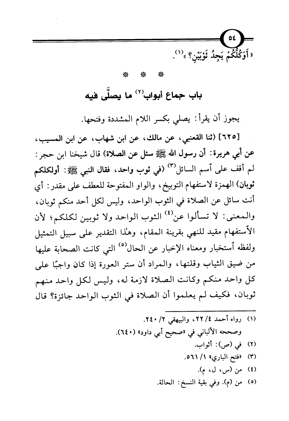 [625] (ثنا القعنبي، عن مالك، عن ابن شهاب، عن ابن المسيب، عن أبي هريرة: أن رسول الله - صلى الله عليه وسلم - سئل عن الصلاة) قال شيخنا ابن حجر: لم أقف على اسم السائل (¬3) (في ثوب واحد، فقال النبي - صلى الله عليه وسلم -: أولكلكم ثوبان) الهمزة لاستفهام التوبيخ، والواو المفتوحة للعطف على مقدر: أي أنت سائل عن الصلاة في الثوب الواحد، وليس لكل أحد منكم ثوبان، والمعنى: لا تسألوا عن (¬4) الثوب الواحد ولا ثوبين لكلكم؛ لأن الاستفهام مقيد للنهي بقرينة المقام، وهذا التقدير على سبيل التمثيل ولفظه استخبار ومعناه الإخبار عن الحال (¬5) التي كانت الصحابة عليها من ضيق الثياب وقلتها، والمراد أن ستر العورة إذا كان واجبًا على كل واحد منكم وكانت الصلاة لازمة له، وليس لكل واحد منهم ثوبان، فكيف لم يعلموا أن الصلاة في الثوب الواحد جائزة؟ قال