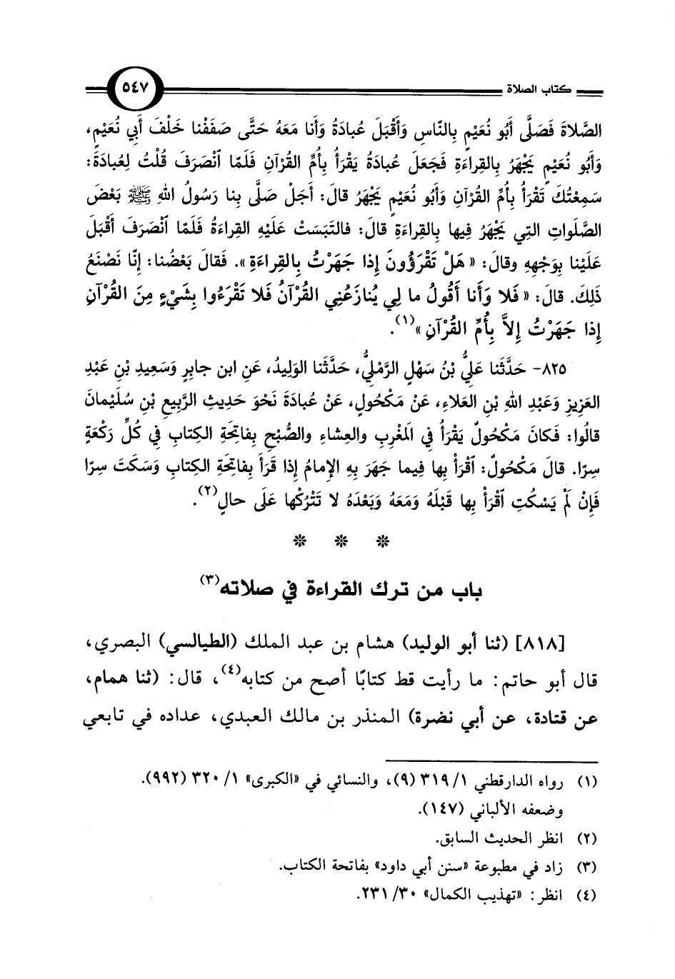 825 - حَدَّثَنا عَلِيُّ بْنُ سَهْلٍ الرَّمْلِيُّ، حَدَّثَنا الوَليدُ، عَنِ ابن جابِرٍ وَسَعِيدِ بْنِ عَبْدِ العَزِيزِ وَعَبْدِ اللهِ بْنِ العَلاءِ، عَنْ مَكْحُولٍ، عَنْ عُبادَةَ نَحْوَ حَدِيثِ الرَّبِيعِ بْنِ سُلَيْمانَ قالوا: فَكانَ مَكْحُولٌ يَقْرَأُ فِي المَغْرِبِ والعِشاءِ والصُّبْحِ بِفاتِحَةِ الكِتابِ فِي كلِّ رَكْعَةٍ سِرًّا. قال مَكْحُولٌ: اقْرَأْ بِها فِيما جَهَرَ بِهِ الإِمامُ إِذا قَرَأَ بِفاتِحَةِ الكِتابِ وَسَكَتَ سِرًّا فَإِنْ لَمْ يَسْكُتِ اقْرَأْ بِها قَبْلَهُ وَمَعَهُ وَبَعْدَهُ لا تَتْرُكْها عَلَى حالٍ (¬2).