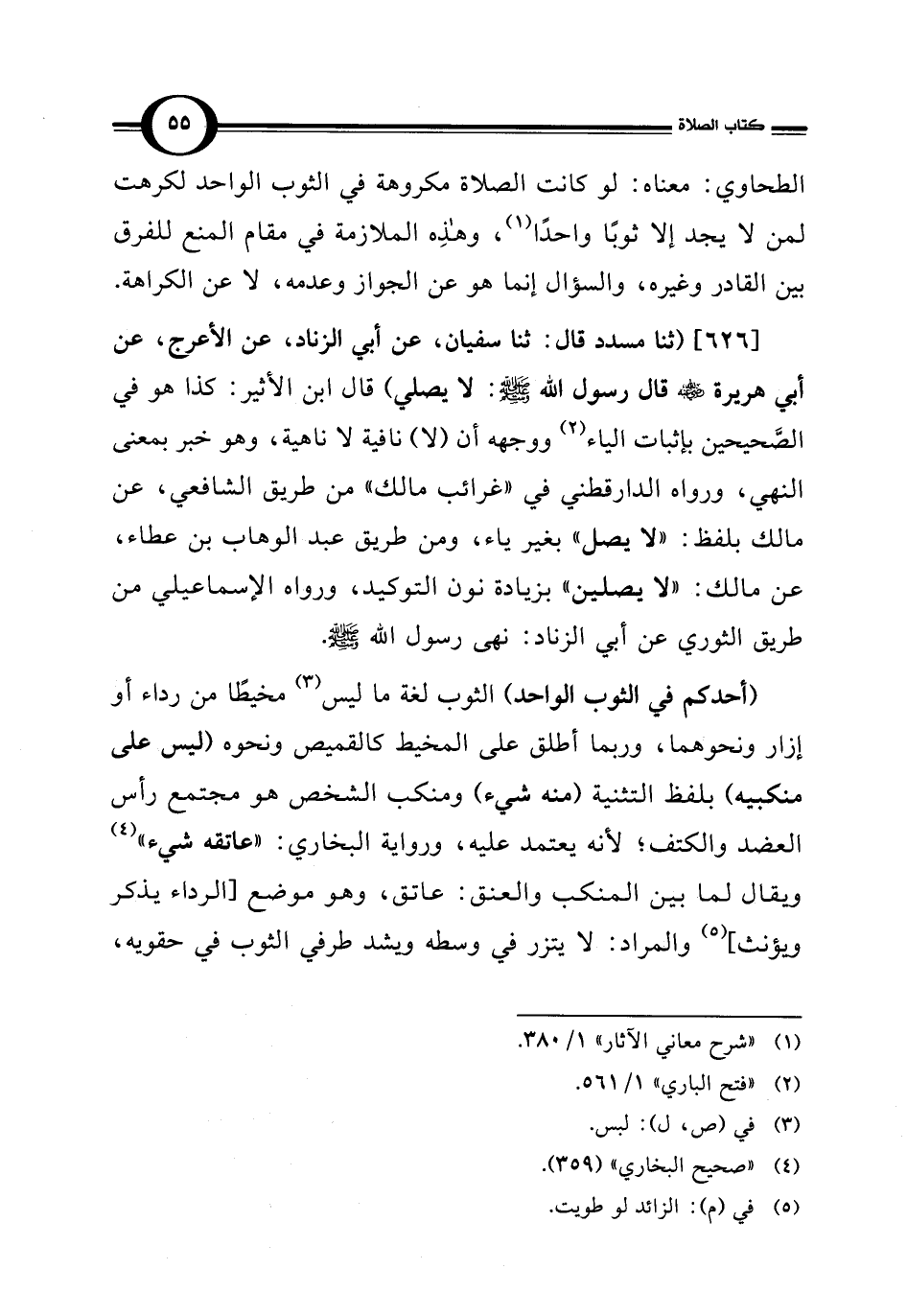 [626] (ثنا مسدد قال: ثنا سفيان، عن أبي الزناد، عن الأعرج، عن أبي هريرة - رضي الله عنه - قال رسول الله - صلى الله عليه وسلم -: لا يصلي) قال ابن الأثير: كذا هو في الصَّحيحين بإثبات الياء (¬2) ووجهه أن (لا) نافية لا ناهية، وهو خبر بمعنى النهي، ورواه الدارقطني في "غرائب مالك" من طريق الشافعي، عن مالك بلفظ: "لا يصل" بغير ياء، ومن طريق عبد الوهاب بن عطاء، عن مالك: "لا يصلين" بزيادة نون التوكيد، ورواه الإسماعيلي من طريق الثوري عن أبي الزناد: نهى رسول الله - صلى الله عليه وسلم -.