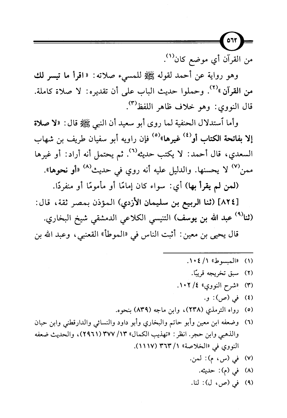 [824] (ثنا الربيع بن سليمان الأزدي) المؤذن بمصر ثقة، قال: (ثنا (¬9) عبد الله بن يوسف) التنيسي الكلاعي الدمشقي شيخ البخاري.