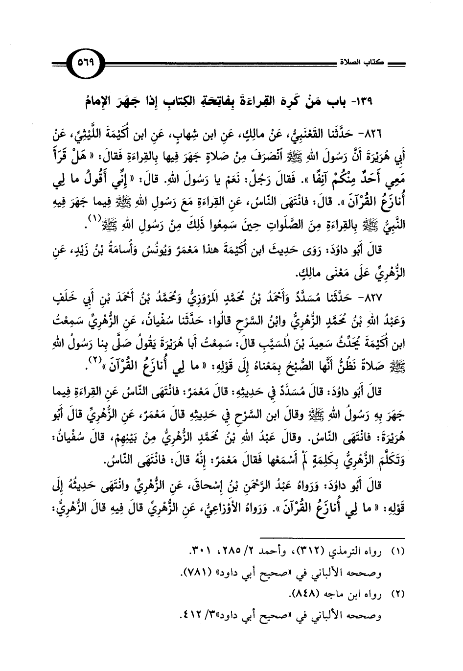 قال أَبُو دَاوُدَ: قال مُسَدَّدٌ فِي حَدِيثِهِ: قال مَعْمَرٌ: فانْتَهَى النَّاسُ عَنِ القِراءَةِ فِيما جَهَرَ بِهِ رَسُول اللهِ - صلى الله عليه وسلم - وقال ابن السَّرْحِ فِي حَدِيثِهِ قال مَعْمَرٌ، عَنِ الزُّهْرِيِّ قال أَبُو هُرَيْرَةَ: فانْتَهَى النّاسُ. وقال عَبْدُ اللهِ بْن مُحَمَّدٍ الزُّهْرِيّ مِنْ بَيْنِهِمْ، قال سُفْيانُ: وَتَكَلَّمَ الزُّهْرِيُّ بِكَلِمَةٍ لَم أَسْمَعْها فَقال مَعْمَرٌ: إِنَّهُ قال: فانْتَهَى النّاسُ.
