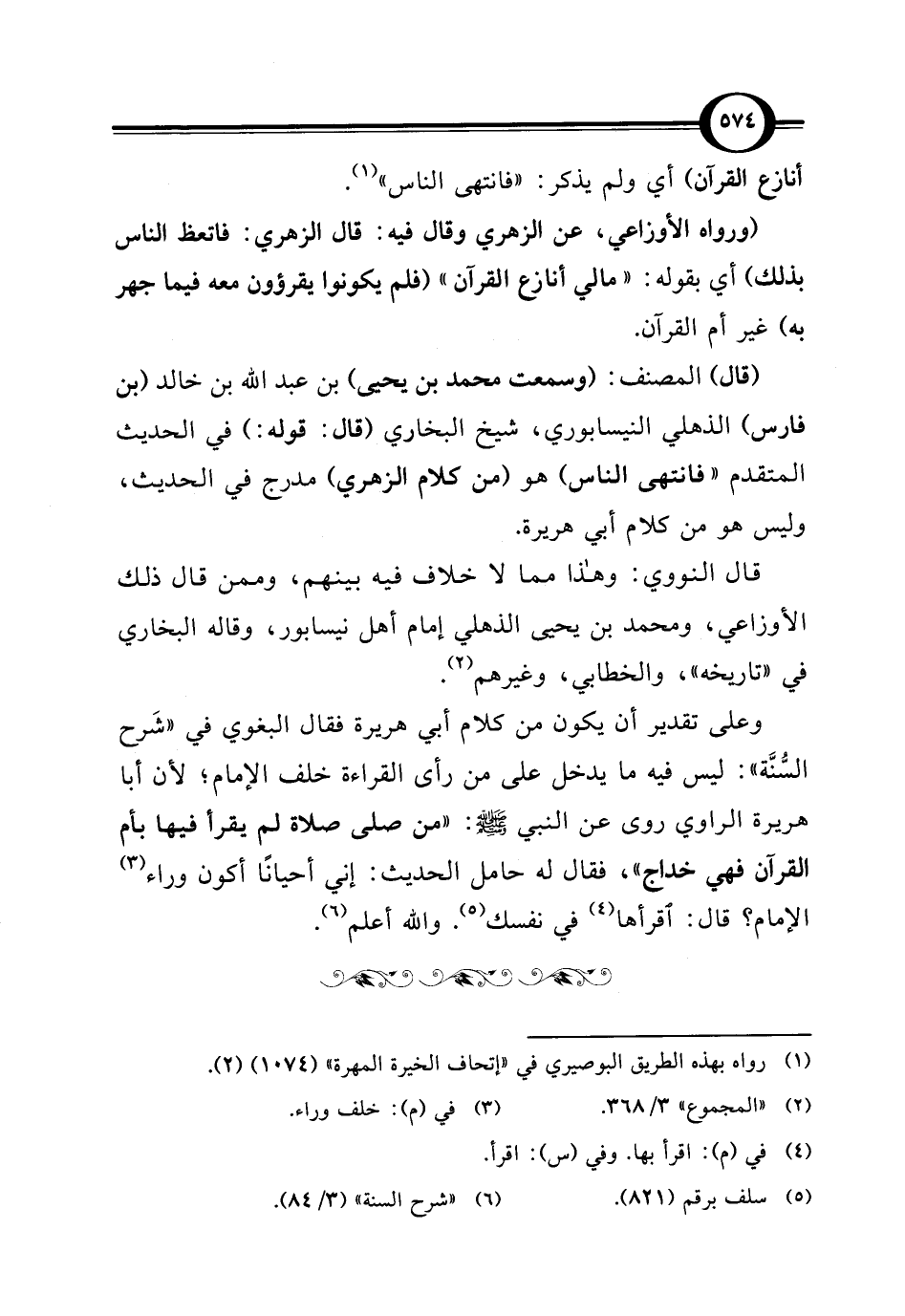 وعلى تقدير أن يكون من كلام أبي هريرة فقال البغوي في "شَرح السُّنَّة": ليس فيه ما يدخل على من رأى القراءة خلف الإمام؛ لأن أبا هريرة الراوي روى عن النبي - صلى الله عليه وسلم -: "من صلى صلاة لم يقرأ فيها بأم القرآن فهي خداج"، فقال له حامل الحديث: إني أحيانًا أكون وراء (¬3) الإمام؟ قال: اقرأها (¬4) في نفسك (¬5). والله أعلم (¬6).