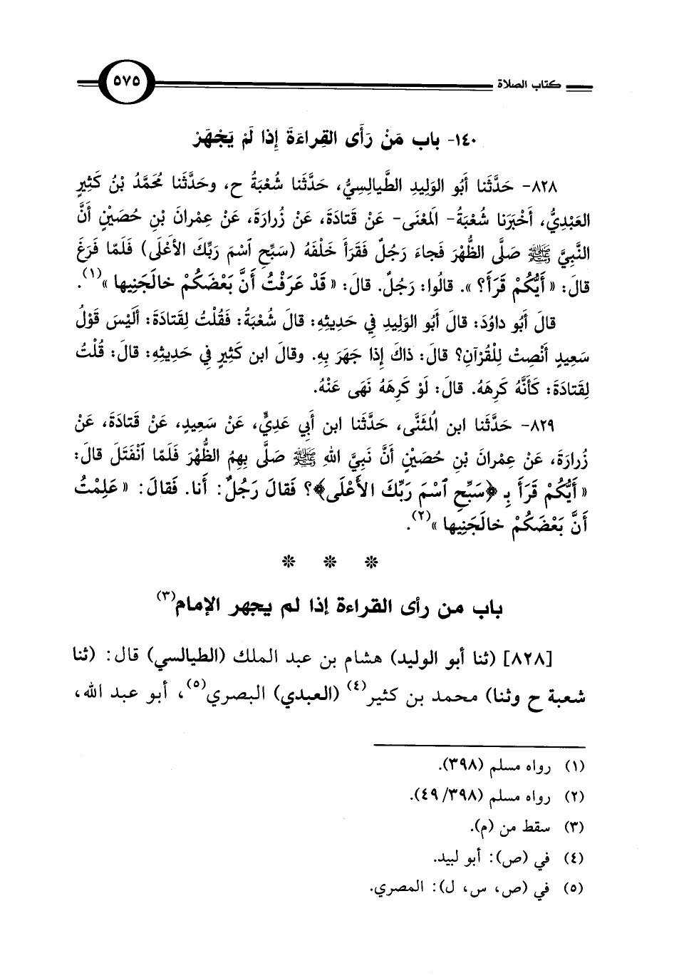 828 - حَدَّثَنا ابُو الوَلِيدِ الطَّيالِسِيُّ، حَدَّثَنا شُعْبَةُ ح، وحَدَّثَنا مُحَمَّدُ بْنُ كَثِيرٍ العَبْدِيُّ، أَخْبَرَنا شُعْبَةُ - الْمَعْنَى - عَنْ قَتادَةَ، عَنْ زُرارَةَ، عَنْ عِمْرانَ بْنِ حُصَيْنٍ أَنَّ النَّبِيَّ - صلى الله عليه وسلم - صَلَّى الظُّهْرَ فَجاءَ رَجُلٌ فَقَرَأَ خَلْفَهُ {سَبِّحِ اسْمَ رَبِّكَ الْأَعْلَى} فَلَمّا فَرَغَ قال: "أَيُّكُمْ قَرَأَ؟ ". قالوا: رَجُلٌ. قال: "قَدْ عَرَفْتُ أَنَّ بَعْضَكُمْ خالجَنِيهَا" (¬1).
