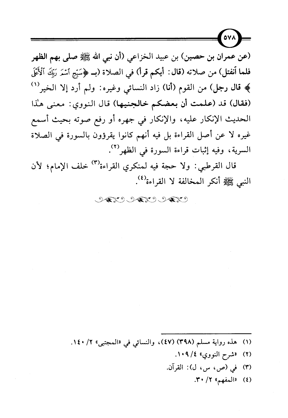 (عن عمران بن حصين) بن عبيد الخزاعي (أن نبي الله - صلى الله عليه وسلم - صلى بهم الظهر فلما انفتل) من صلاته (قال: أيكم قرأ) في الصلاة (بـ {سَبِّحِ اسْمَ رَبِّكَ الْأَعْلَى} قال رجل) من القوم (أنا) زاد النسائي وغيره: ولم أرد إلا الخير (¬1) (فقال) قد (علمت أن بعضكم خالجنيها) قال النووي: معنى هذا الحديث الإنكار عليه، والإنكار في جهره أو رفع صوته بحيث أسمع غيره لا عن أصل القراءة بل فيه أنهم كانوا يقرؤون بالسورة في الصلاة السرية، وفيه إثبات قراءة السورة في الظهر (¬2).
