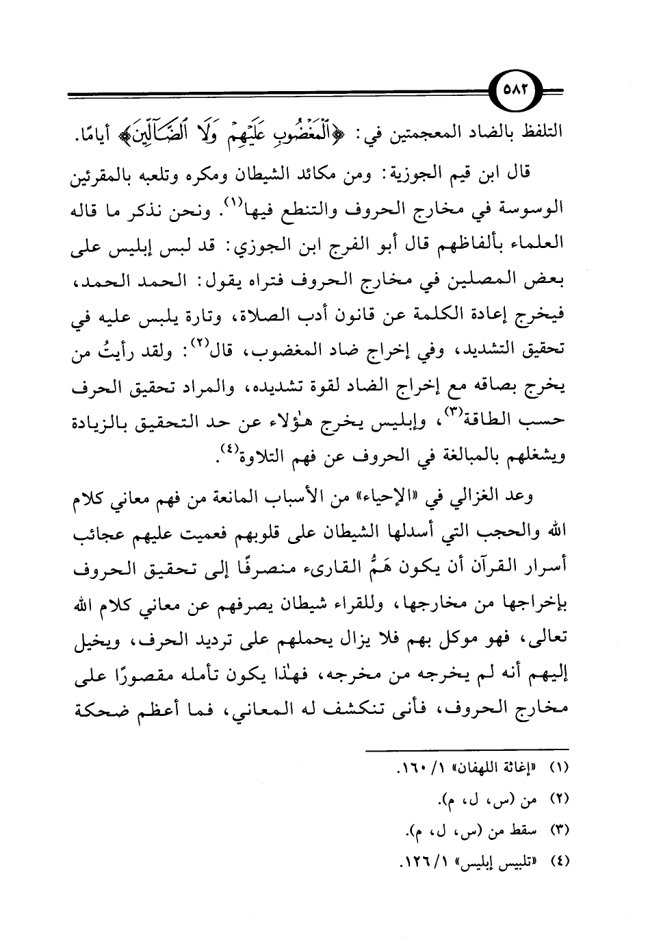 قال ابن قيم الجوزية: ومن مكائد الشيطان ومكره وتلعبه بالمقرئين الوسوسة في مخارج الحروف والتنطع فيها (¬1). ونحن نذكر ما قاله العلماء بألفاظهم قال أبو الفرج ابن الجوزي: قد لبس إبليس على بعض المصلين في مخارج الحروف فتراه يقول: الحمد الحمد، فيخرج إعادة الكلمة عن قانون أدب الصلاة، وتارة يلبس عليه في تحقيق التشديد، وفي إخراج ضاد المغضوب، قال (¬2): ولقد رأيتُ من يخرج بصاقه مع إخراج الضاد لقوة تشديده، والمراد تحقيق الحرف حسب الطاقة (¬3)، وإبليس يخرج هؤلاء عن حد التحقيق بالزيادة ويشغلهم بالمبالغة في الحروف عن فهم التلاوة (¬4).