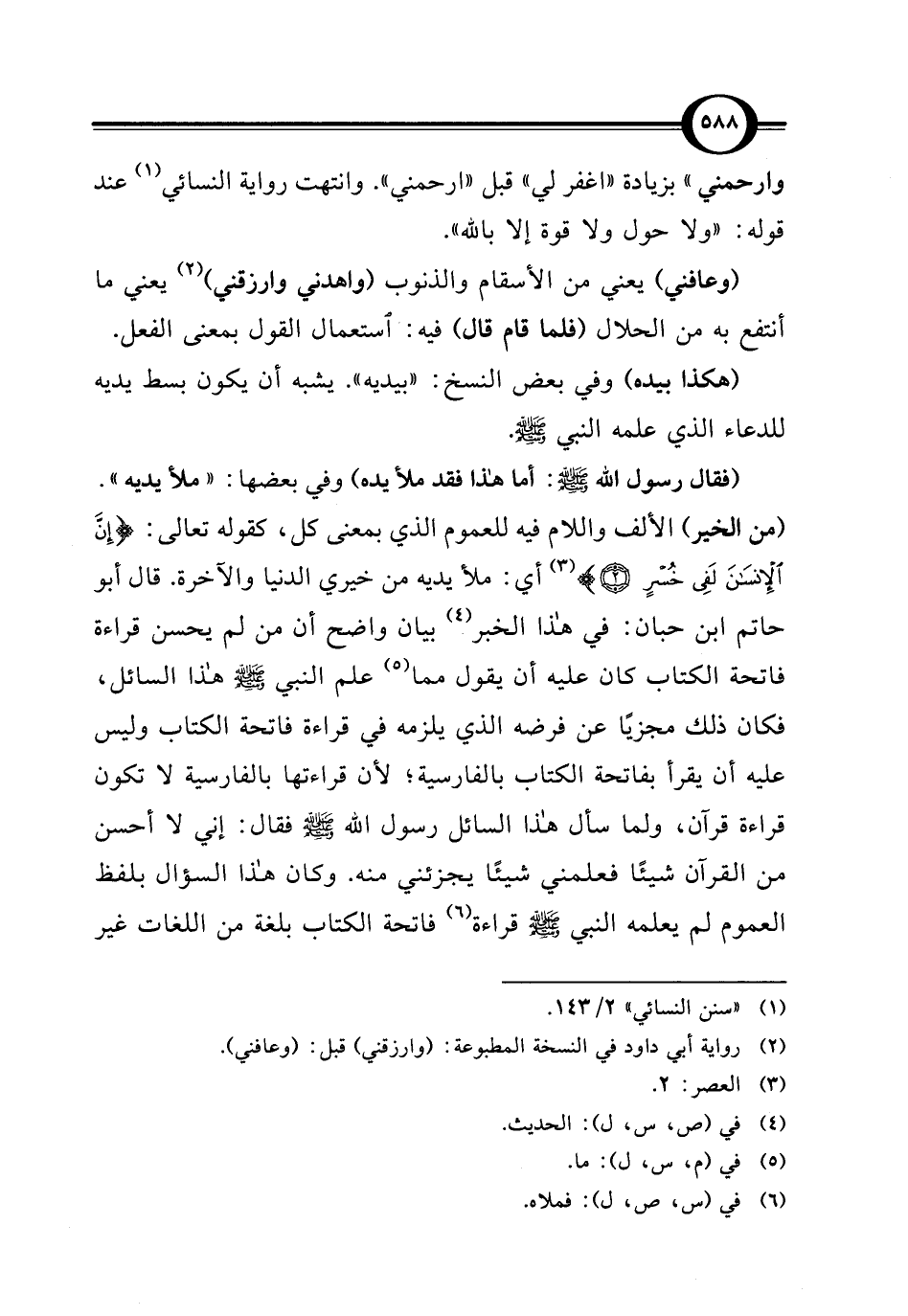 وارحمني" بزيادة "اغفر لي" قبل "ارحمني". وانتهت رواية النسائي (¬1) عند قوله: "ولا حول ولا قوة إلا بالله".