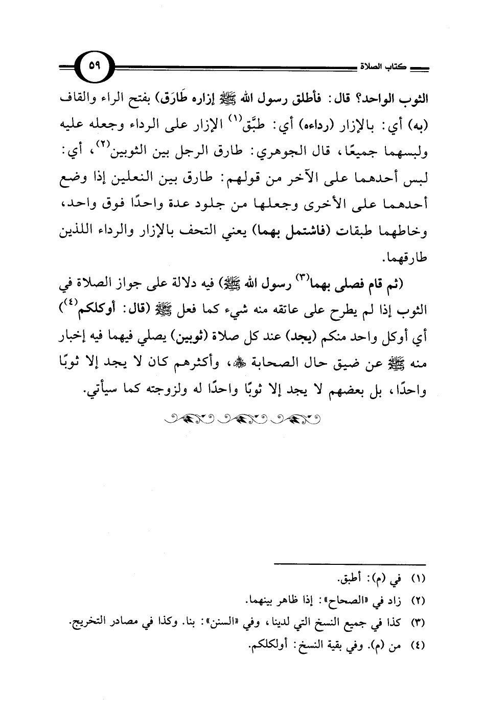 (ثم قام فصلى بهما (¬3) رسول الله - صلى الله عليه وسلم -) فيه دلالة على جواز الصلاة في الثوب إذا لم يطرح على عاتقه منه شيء كما فعل - صلى الله عليه وسلم - (قال: أوكلكم) (¬4) أي أوكل واحد منكم (يجد) عند كل صلاة (ثوبين) يصلي فيهما فيه إخبار منه - صلى الله عليه وسلم - عن ضيق حال الصحابة - رضي الله عنهم -، وأكثرهم كان لا يجد إلا ثوبًا واحدًا، بل بعضهم لا يجد إلا ثوبًا واحدًا له ولزوجته كما سيأتي.