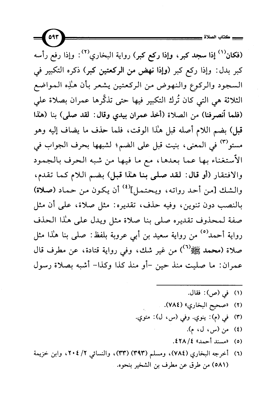 (فكان (¬1) إذا سجد كبر، وإذا ركع كبر) رواية البخاري (¬2): وإذا رفع رأسه كبر بدل: وإذا ركع كبر (وإذا نهض من الركعتين كبر) ذكره التكبير في السجود والركوع والنهوض من الركعتين يشعر بأن هذِه المواضع الثلاثة هي التي كان تُرك التكبير فيها حتى تذكَّرها عمران بصلاة علي (فلما انصرفنا) من الصلاة (أخذ عمران بيدي وقال: لقد صلى) بنا (هذا قبل) بضم اللام أصله قبل هذا الوقت، فلما حذف ما يضاف إليه وهو مستو (¬3) في المعنى، بنيت قبل على الضم؛ لشبهها بحرف الجواب في الاستغناء بها عما بعدها، مع ما فيها من شبه الحرف بالجمود والافتقار (أو قال: لقد صلى بنا هذا قبل) بضم اللام كما تقدم، والشك [من أحد رواته، ويحتمل] (¬4) أن يكون من حماد (صلاة) بالنصب دون تنوين، وفيه حذف، تقديره: مثل صلاة، على أن مثل صفة لمحذوف تقديره صلى بنا صلاة مثل ويدل على هذا الحذف رواية أحمد (¬5) من رواية سعيد بن أبي عروبة بلفظ: صلى بنا هذا مثل صلاة (محمد -صلى الله عليه وسلم- (¬6) من غير شك، وفي رواية قتادة، عن مطرف قال عمران: ما صليت منذ حين -أو منذ كذا وكذا- أشبه بصلاة رسول