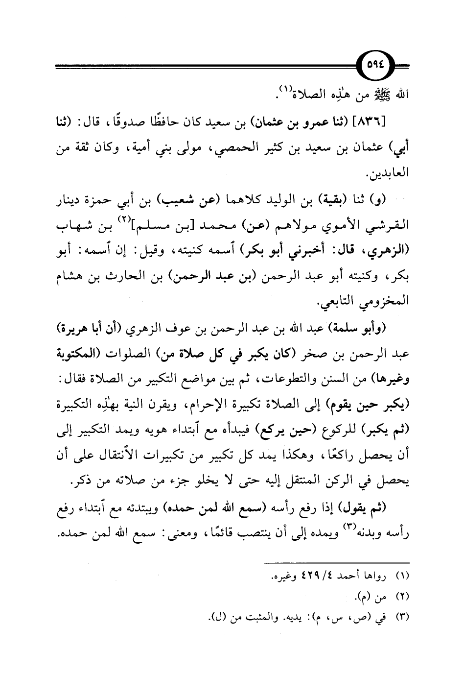 [836] (ثنا عمرو بن عثمان) بن سعيد كان حافظًا صدوقًا، قال: (ثنا أبي) عثمان بن سعيد بن كثير الحمصي، مولى بني أمية، وكان ثقة من العابدين.