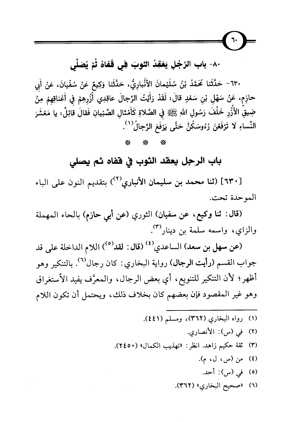 630 - حَدَّثَنا مُحَمَّدُ بْن سُلَيْمانَ الأَنْبارِيُّ، حَدَّثَنا وَكِيعٌ عَنْ سُفْيانَ، عَنْ أَبِي حازِمٍ، عَنْ سَهْلِ بْنِ سَعْدٍ قال: لَقَدْ رَأَيْتُ الرِّجال عاقِدِي أُزُرِهِمْ فِي أَعْناقِهِمْ مِنْ ضِيقِ الأُزُرِ خَلْفَ رَسُولِ اللهِ - صلى الله عليه وسلم - فِي الصَّلاةِ كَأَمْثالِ الصِّبْيانِ فَقال قائِلٌ: يا مَعْشَرَ النِّساءِ لا تَرْفَعْنَ رُءُوسَكُنَّ حَتَّى يَرْفَعَ الرِّجال (¬1).