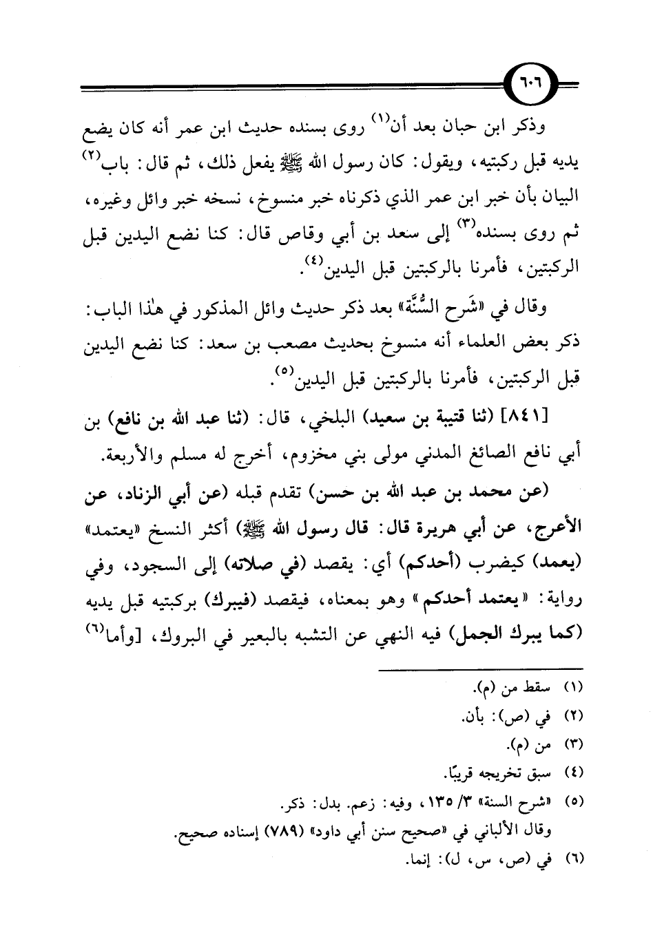 وذكر ابن حبان بعد أن (¬1) روى بسنده حديث ابن عمر أنه كان يضع يديه قبل ركبتيه، ويقول: كان رسول الله -صلى الله عليه وسلم- يفعل ذلك، ثم قال: باب (¬2) البيان بأن خبر ابن عمر الذي ذكرناه خبر منسوخ، نسخه خبر وائل وغيره، ثم روى بسنده (¬3) إلى شعد بن أبي وقاص قال: كنا نضع اليدين قبل الركبتين، فأمرنا بالركبتين قبل اليدين (¬4).