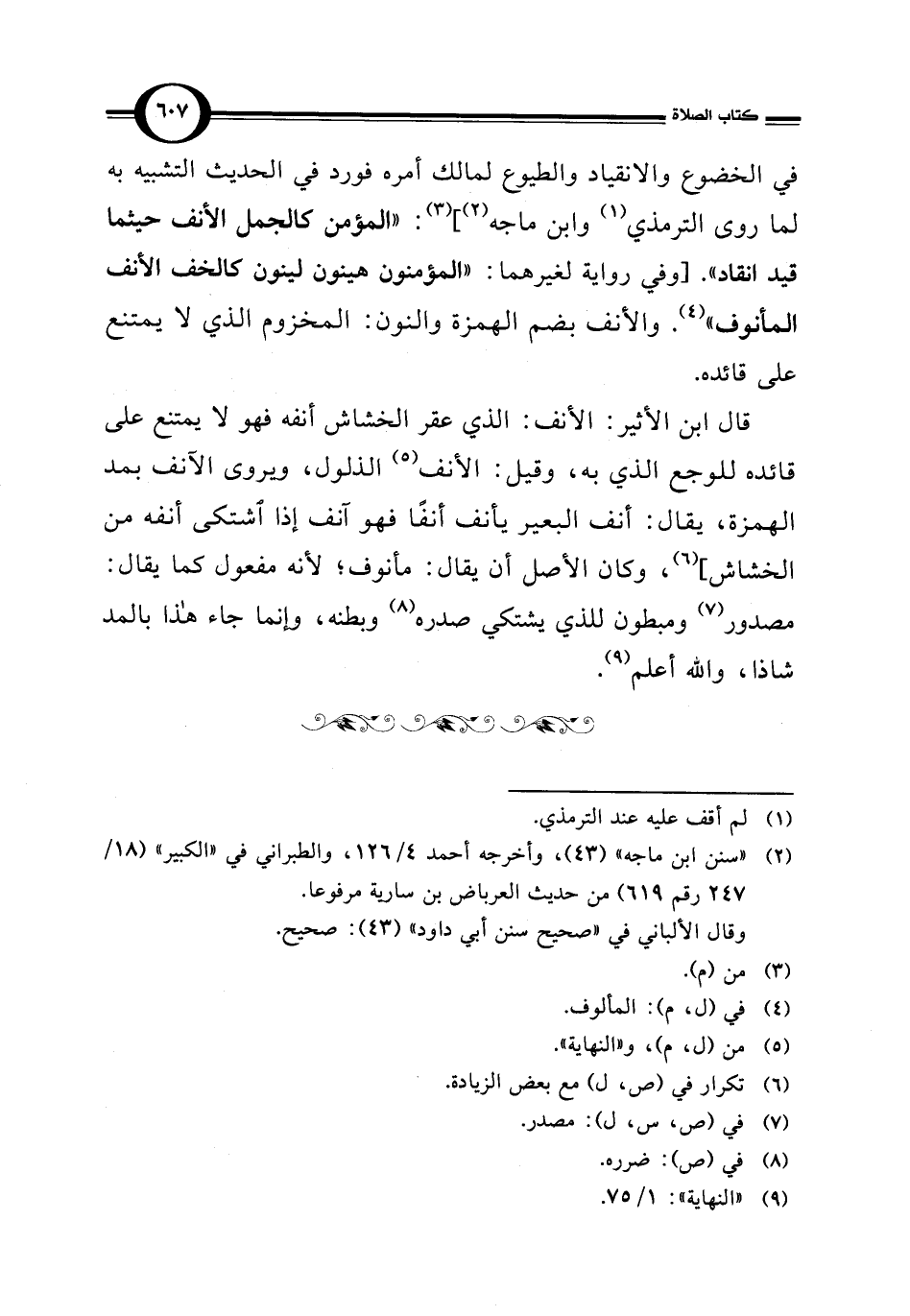 في الخضوع والانقياد والطيوع لمالك أمره فورد في الحديث التشبيه به لما روى الترمذي (¬1) وابن ماجه (¬2)] (¬3): "المؤمن كالجمل الأنف حيثما قيد انقاد". [وفي رواية لغيرهما: "المؤمنون هينون لينون كالخف الأنف المأنوف" (¬4). والأنف بضم الهمزة والنون: المخزوم الذي لا يمتنع على قائده.