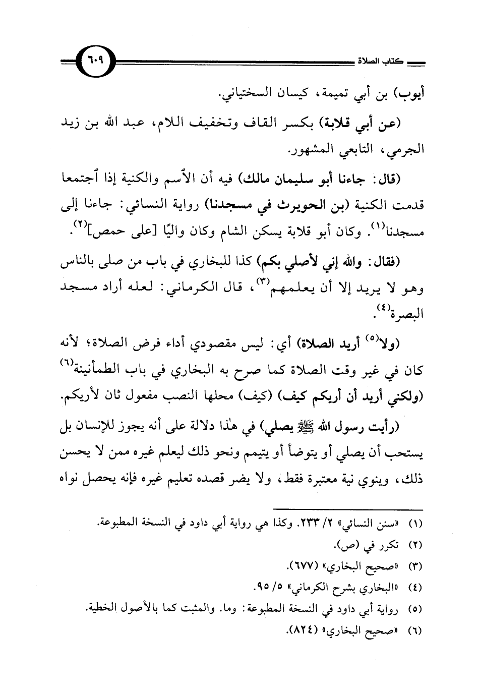 (قال: جاءنا أبو سليمان مالك) فيه أن الاسم والكنية إذا اجتمعا قدمت الكنية (بن الحويرث في مسجدنا) رواية النسائي: جاءنا إلى مسجدنا (¬1). وكان أبو قلابة يسكن الشام وكان واليًا [على حمص] (¬2).