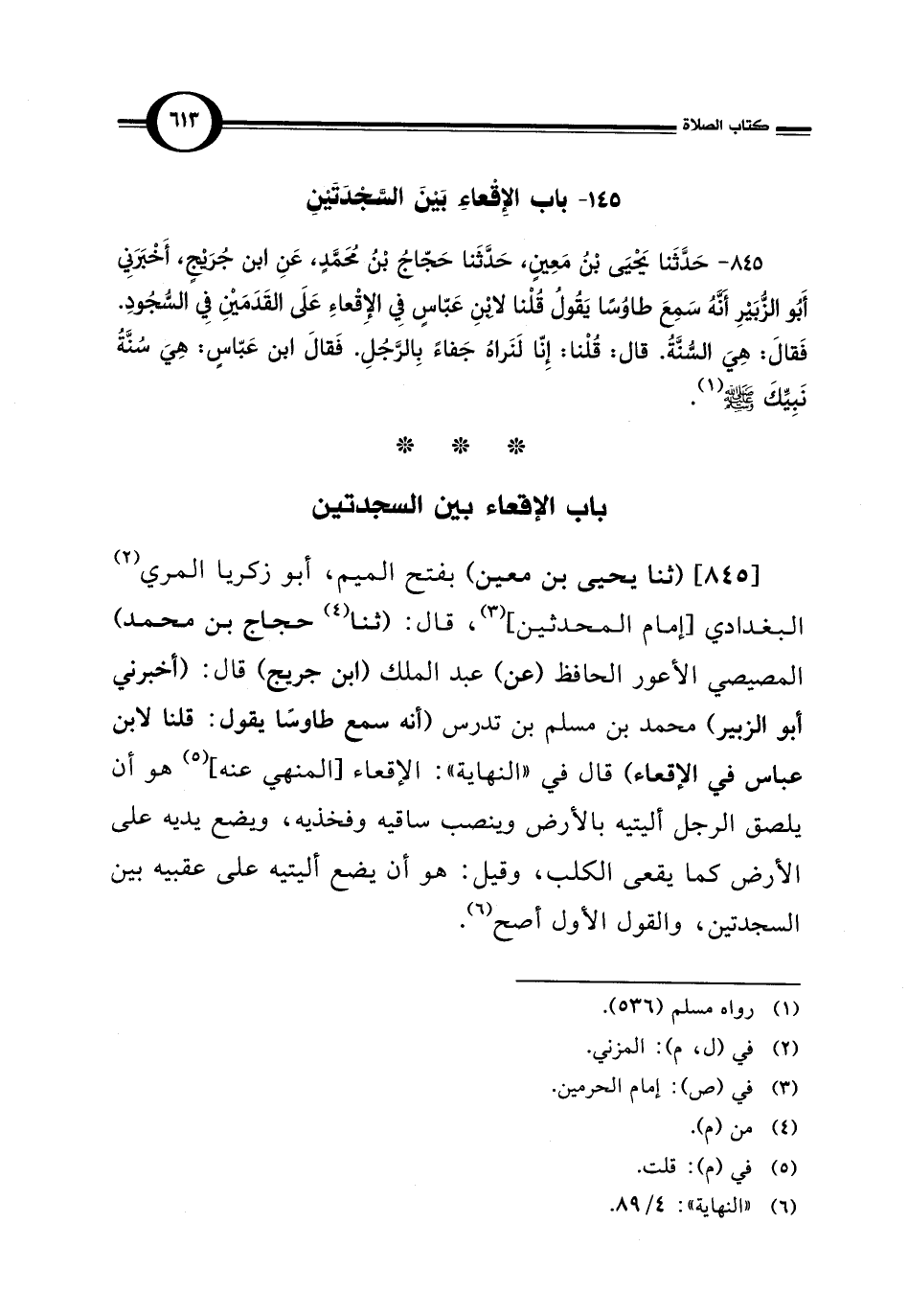 845 - حَدَّثَنا يحيَى بْن مَعِينٍ، حَدَّثَنا حَجّاج بْنُ محَمَّدٍ، عَنِ ابن جُرَيْجٍ، أَخْبَرَنِي أَبُو الزُّبَيْرِ أنَّه سَمِعَ طاوسًا يَقولُ قلْنا لايْنِ عَبّاسٍ فِي الإِقْعاءِ عَلَى القَدَمَيْنِ فِي السُّجودِ. فَقال: هِيَ السُّنَّةُ. قال: قُلْنا: إِنّا لَنَراهُ جَفاءً بِالرَّجُلِ. فَقال ابن عَبّاسٍ: هِيَ سُنَّةُ نَبِيِّكَ -صلى الله عليه وسلم- (¬1)