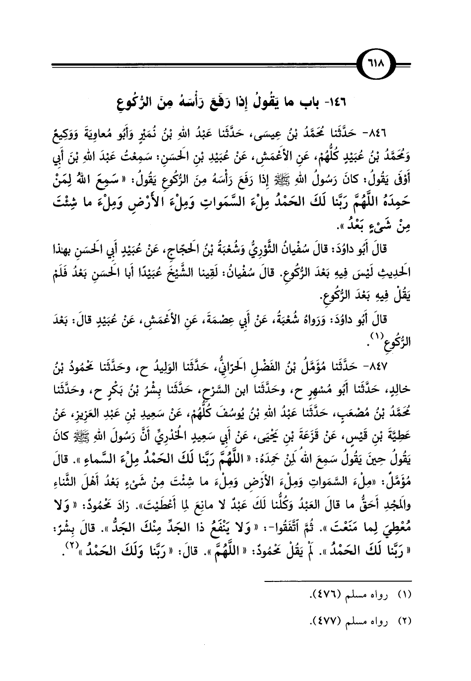 847 - حَدَّثَنا مؤَمَّل بْنُ الفَضْلِ الحرَّانيُّ، حَدَّثَنا الوَلِيد ح، وحَدَّثَنا مَحْمودُ بْنُ خالِدٍ، حَدَّثَنا أَبو مسْهِرٍ ح، وحَدَّثَنا ابن السَّرْح، حَدَّثَنا بِشْرُ بْن بَكْرٍ ح، وحَدَّثَنا محَمَّد بْن مُصْعَبٍ، حَدَّثَنا عَبْد اللهِ بْن يُوسُفَ كَلُّهمْ، عَنْ سَعِيدِ بْنِ عَبْدِ العَزِيزِ، عَنْ عطَيَّةَ بْنِ قَيْسٍ، عَنْ قَزَعَةَ بْنِ يحيَى، عَنْ أَبِي سَعِيدٍ الخدْرِيِّ أَنَّ رَسُولَ اللهِ -صلى الله عليه وسلم- كانَ يَقُولُ حِينَ يَقول سَمِعَ الله لَمِنْ حَمِدَهُ: "اللَّهُمَّ رَبَّنا لَكَ الحَمْدُ مِلْءَ السَّماءِ". قال مُؤَمَّلٌ: "مِلْءَ السَّمَواتِ وَمِلْءَ الأرْضِ وَمِلْءَ ما شِئْتَ مِنْ شَيْءٍ بَعْدُ أَهْلَ الثَّناءِ والمجْدِ أَحَقُّ ما قال العَبْدُ وَكُلُّنا لَكَ عَبْدٌ لا مانِعَ لمِا أَعطيْتَ". زادَ مَحْمُودٌ: "وَلا مُعْطِيَ لِما مَنَعْتَ". ثُمَّ اتَّفَقُوا-: "وَلا يَنْفَعُ ذا الجَدِّ مِنْكَ الجَدُّ". قال بِشْرٌ: "رَبَّنا لَكَ الحَمْدُ".لم يَقلْ مَحْمُودٌ: "اللَّهُمَّ". قال: "رَبَّنا وَلَكَ الحَمْدُ" (¬2).
