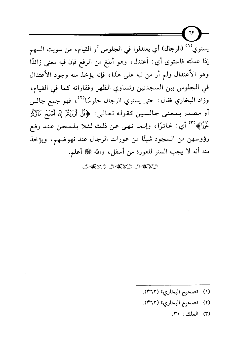يستوي (¬1) (الرجال) أي يعتدلوا في الجلوس أو القيام، من سويت السهم إذا عدلته فاستوى أي: اعتدل، وهو أبلغ من الرفع فإن فيه معنى زائدًا وهو الاعتدال ولم أر من نبه على هذا، فإنه يؤخذ منه وجود الاعتدال في الجلوس بين السجدتين وتساوي الظهر وفقاراته كما في القيام، وزاد البخاري فقال: حتى يستوي الرجال جلوسًا (¬2)، فهو جمع جالس أو مصدر بمعنى جالسين كقوله تعالى: {قُلْ أَرَأَيْتُمْ إِنْ أَصْبَحَ مَاؤُكُمْ غَوْرًا} (¬3) أي: غائرًا، وإنما نهى عن ذلك لئلا يلمحن عند رفع رؤوسهن من السجود شيئًا من عورات الرجال عند نهوضهم، ويؤخذ منه أنه لا يجب الستر للدورة من أسفل، والله سبحانه وتعالى أعلم.