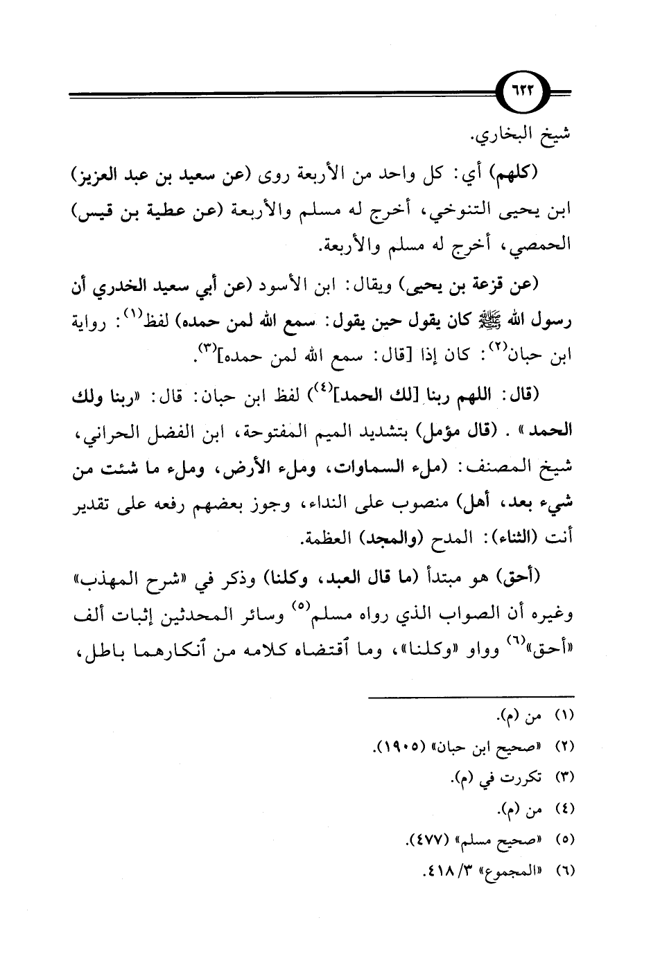 (أحق) هو مبتدأ (ما قال العبد، وكلنا) وذكر في "شرح المهذب" وغيره أن الصواب الذي رواه مسلم (¬5) وسائر المحدثين إثبات ألف "أحق" (¬6) وواو "وكلنا"، وما اقتضاه كلامه من إنكارهما باطل،