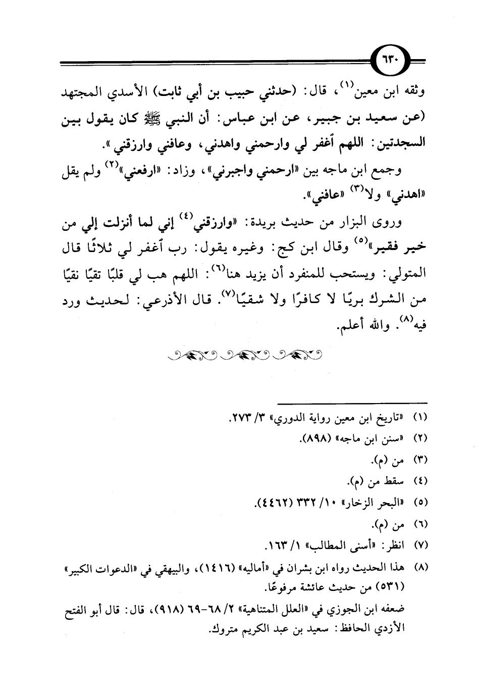 وثقه ابن معين (¬1)، قال: (حدثني حبيب بن أبي ثابت) الأسدي المجتهد (عن سعيد بن جبير، عن ابن عباس: أن النبي -صلى الله عليه وسلم- كان يقول بين السجدتين: اللهم اغفر لي وارحمني واهدني، وعافني وارزقني".