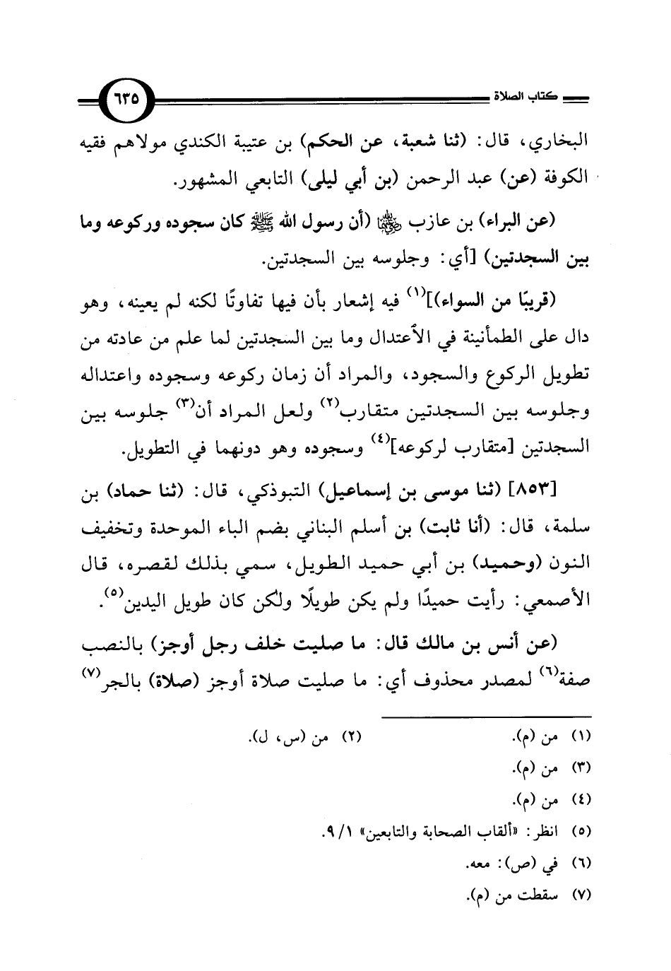 [853] (ثنا موسى بن إسماعيل) التبوذكي، قال: (ثنا حماد) بن سلمة، قال: (أنا ثابت) بن أسلم البناني بضم الباء الموحدة وتخفيف النون (وحميد) بن أبي حميد الطويل، سمي بذلك لقصره، قال الأصمعي: رأيت حميدًا ولم يكن طويلًا ولكن كان طويل اليدين (¬5).