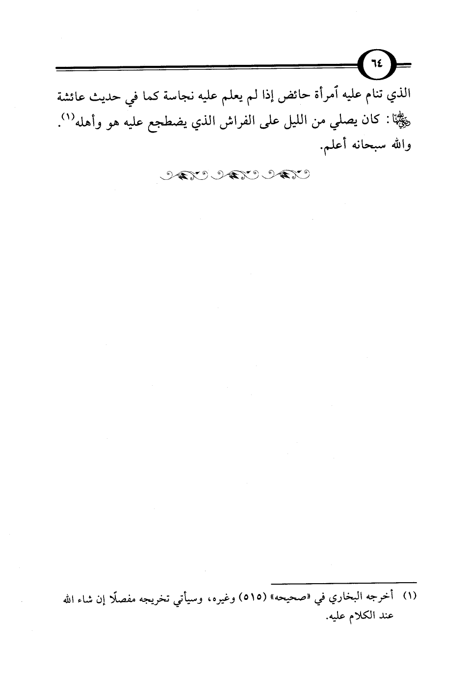 الذي تنام عليه امرأة حائض إذا لم يعلم عليه نجاسة كما في حديث عائشة - رضي الله عنها -: كان يصلي من الليل على الفراش الذي يضطجع عليه هو وأهله (¬1). والله سبحانه أعلم.