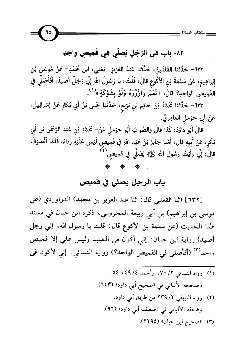 632 - حَدَّثَنا القَعْنَبِيُّ، حَدَّثَنا عَبْدُ العَزِيزِ -يَعْنِي: ابن مُحَمَّدٍ- عَنْ مُوسَى بْنِ إِبْراهِيمَ، عَنْ سَلَمَةَ بْنِ الأَكْوَعِ قال: قُلْتُ: يا رَسُولَ اللهِ إِنِّي رَجُلٌ أَصِيدُ، أَفأُصَلِّي فِي القَمِيصِ الواحِدِ؟ قال: "نَعَمْ وازْرُرْهُ وَلَوْ بِشَوْكَةٍ" (¬1).
