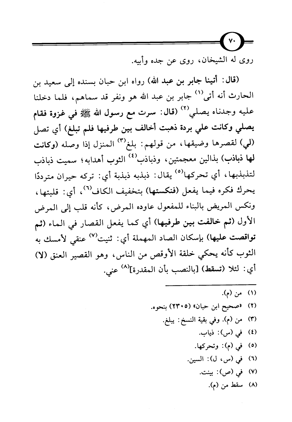 (قال: أتينا جابر بن عبد الله) رواه ابن حبان بسنده إلى سعيد بن الحارث أنه أتى (¬1) جابر بن عبد الله هو ونفر قد سماهم، فلما دخلنا عليه وجدناه يصلي (¬2) (قال: سرت مع رسول الله - صلى الله عليه وسلم - في غزوة فقام يصلي وكانت علي بردة ذهبت أخالف بين طرفيها فلم تبلغ) أي تصل (لي) لقصرها وضيقها، من قولهم: بلغ (¬3) المنزل إذا وصله (وكانت لها ذباذب) بذالين معجمتين، وذباذب (¬4) الثوب أهدابه؛ سميت ذباذب لتذبذبها، أي تحركها (¬5) يقال: ذبذبه ذبذبة أي: تركه حيران مترددًا يحرك فكره فيما يفعل (فنكستها) بتخفيف الكاف (¬6)، أي: قلبتها، ونكس المريض بالبناء للمفعول عاوده المرض، كأنه قلب إلى المرض الأول (ثم خالفت بين طرفيها) أي كما يفعل القصار في الماء (ثم تواقصت عليها) بإسكان الصاد المهملة أي: ثنيت (¬7) عنقي لأمسك به الثوب كأنه يحكي خلقة الأوقص من الناس، وهو القصير العنق (لا) أي: لئلا (تسقط) [بالنصب بأن المقدرة] (¬8) عني.
