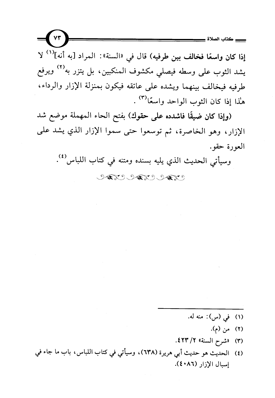 إذا كان واسعًا فخالف بين طرفيه) قال في "السنة": المراد [به أنه] (¬1) لا يشد الثوب على وسطه فيصلي مكشوف المنكبين، بل يتزر به (¬2) ويرفع طرفيه فيخالف بينهما ويشده على عاتقه فيكون بمنزلة الإزار والرداء، هذا إذا كان الثوب الواحد واسعًا (¬3).