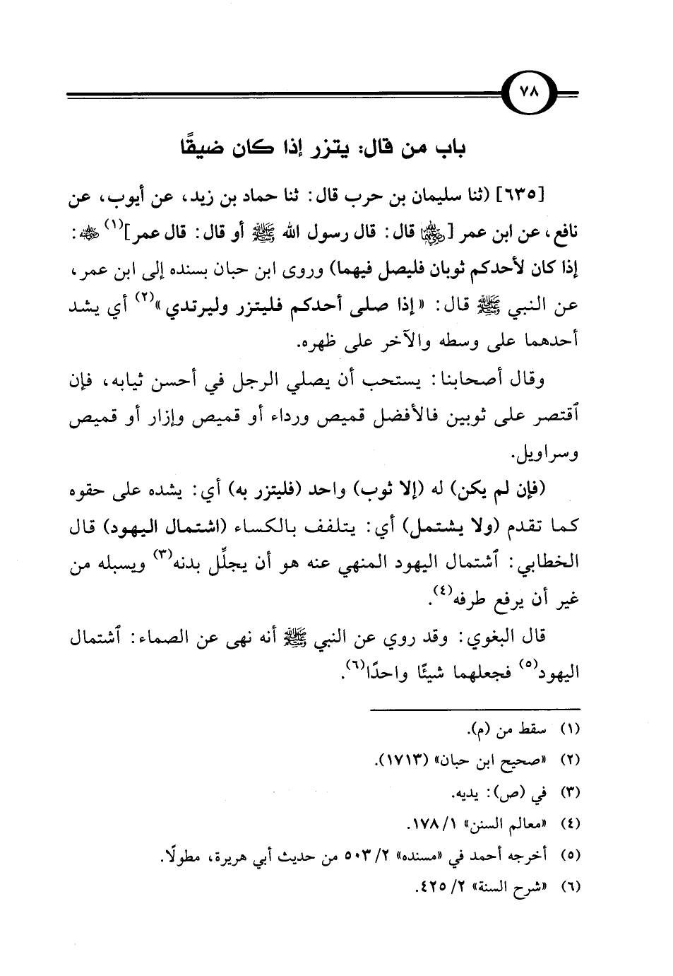 [635] (ثنا سليمان بن حرب قال: ثنا حماد بن زيد، عن أيوب، عن نافع، عن ابن عمر [- رضي الله عنهما - قال: قال رسول الله - صلى الله عليه وسلم - أو قال: قال عمر] (¬1) - رضي الله عنه -: إذا كان لأحدكم ثوبان فليصل فيهما) وروى ابن حبان بسنده إلى ابن عمر، عن النبي - صلى الله عليه وسلم - قال: "إذا صلى أحدكم فليتزر وليرتدي" (¬2) أي يشد أحدهما على وسطه والآخر على ظهره.