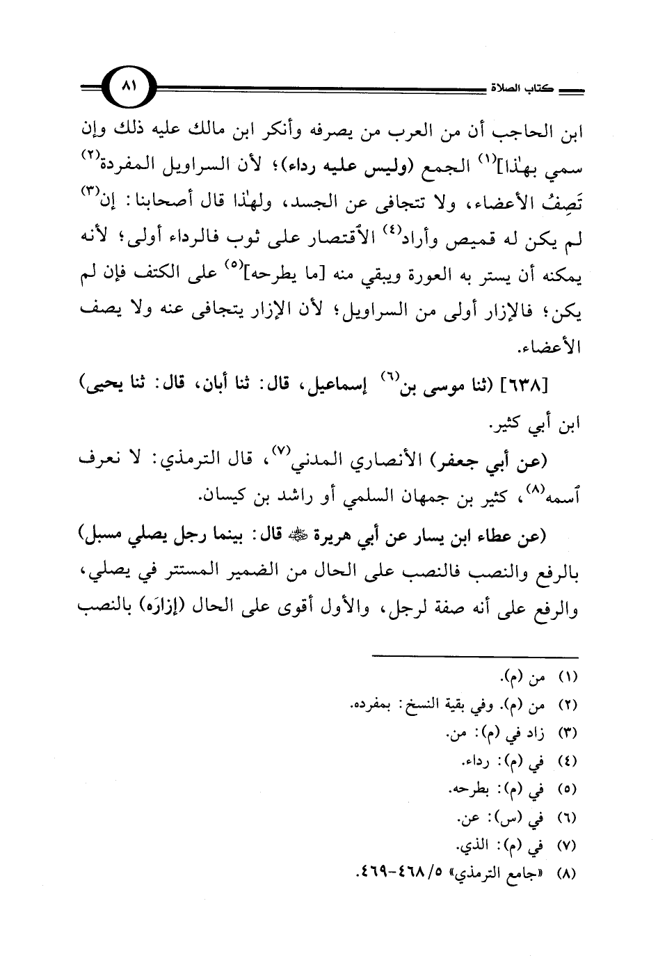 ابن الحاجب أن من العرب من يصرفه وأنكر ابن مالك عليه ذلك وإن سمي بهذا] (¬1) الجمع (وليس عليه رداء)؛ لأن السراويل المفردة (¬2) تَصِفُ الأعضاء، ولا تتجافى عن الجسد، ولهذا قال أصحابنا: إن (¬3) لم يكن له قميص وأراد (¬4) الاقتصار على ثوب فالرداء أولى؛ لأنه يمكنه أن يستر به العورة ويبقي منه [ما يطرحه] (¬5) على الكتف فإن لم يكن؛ فالإزار أولى من السراويل؛ لأن الإزار يتجافى عنه ولا يصف الأعضاء.