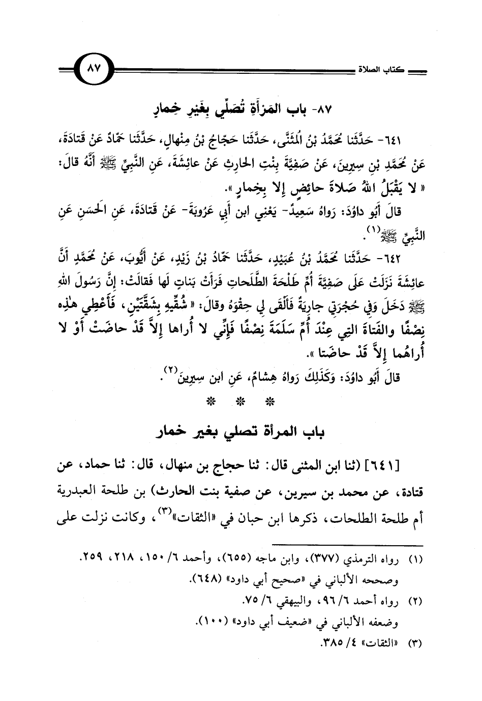 641 - حَدَّثَنا مُحَمَّد بْنُ المُثَنَّى، حَدَّثَنا حَجّاجُ بْنُ مِنْهالٍ، حَدَّثَنا حَمّادٌ عَنْ قَتادَةَ، عَنْ مُحَمَّدِ بْنِ سِيِرينَ، عَنْ صَفِيَّةَ بِنْتِ الحارِثِ عَنْ عائِشَةَ، عَنِ النَّبِيِّ - صلى الله عليه وسلم - أَنَّهُ قال: "لا يَقْبَلُ الله صَلاةَ حائِضٍ إِلا بِخِمارٍ".