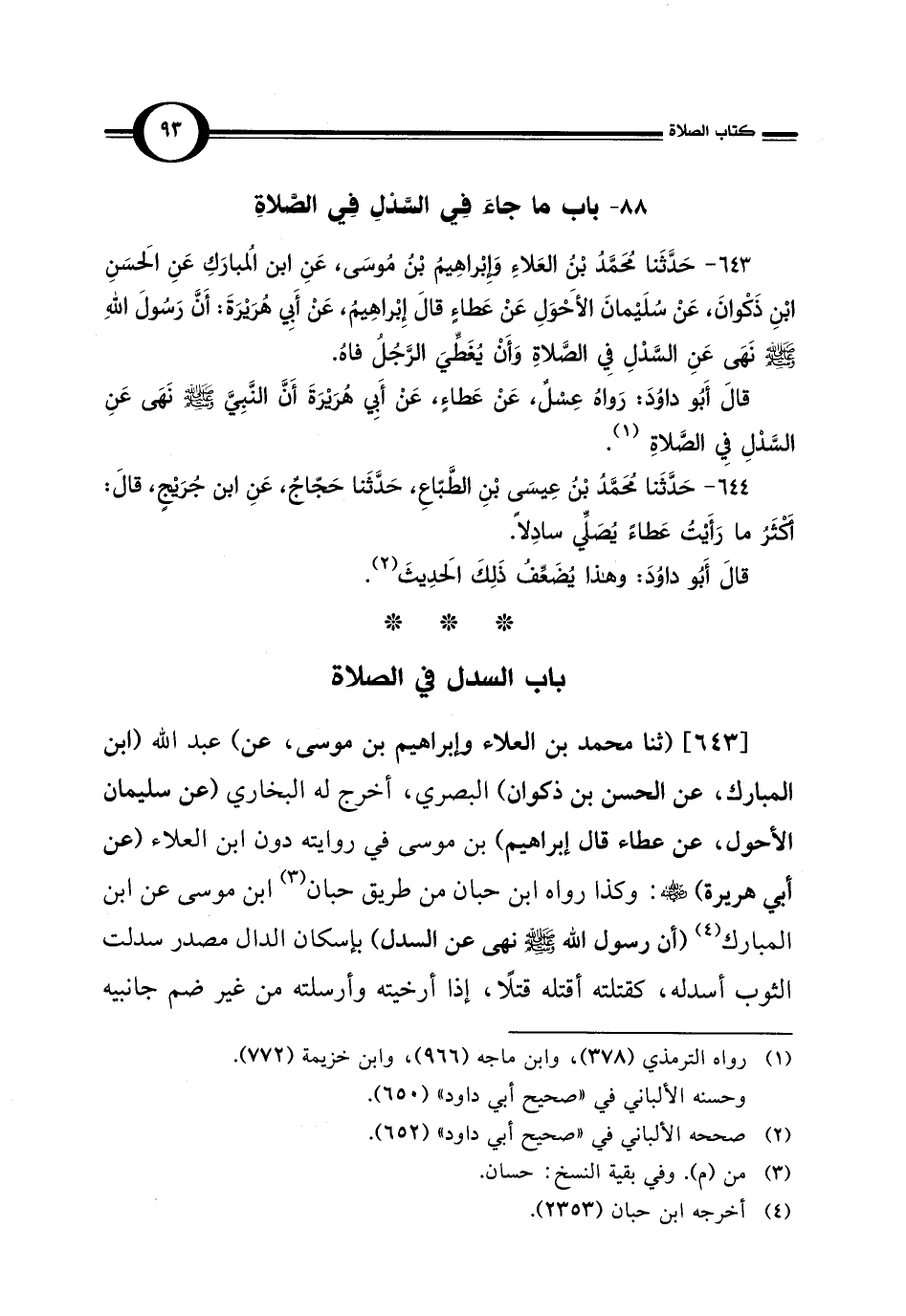 643 - حَدَّثَنا مُحَمَّدُ بْنُ العَلاءِ وَابْراهِيم بْن مُوسَى، عَنِ ابن المُبارَكِ عَنِ الحَسَنِ بْنِ ذَكْوانَ، عَنْ سُلَيْمانَ الأحْوَلِ عَنْ عَطَاءٍ قال إِبْراهِيمُ، عَنْ أَبِي هُرَيْرَةَ: أَنَّ رَسولَ اللهِ -صلى الله عليه وسلم- نَهَى عَنِ السَّدْلِ فِي الصَّلاةِ وَأَنْ يُغَطِّيَ الرَّجُلُ فاهُ.