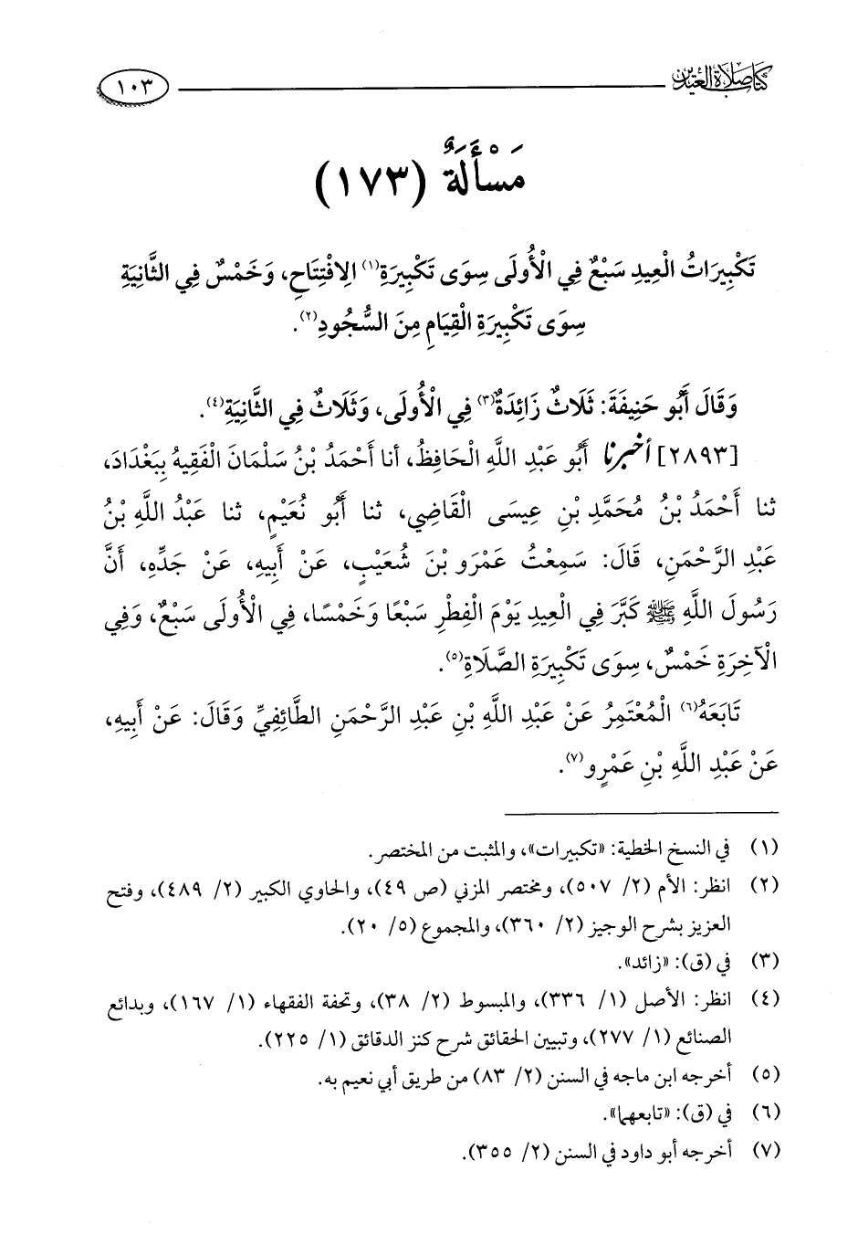 مَسْأَلَةٌ (173): تَكْبِيرَاتُ الْعِيدِ سَبْعٌ فِي الْأُولَى سِوَى تَكْبِيرَةِ (¬1) الِافْتِتَاحِ، وَخَمْسٌ فِي الثَّانِيَةِ سِوَى تَكْبِيرَةِ الْقِيَامِ مِنَ السُّجُودِ (¬2).