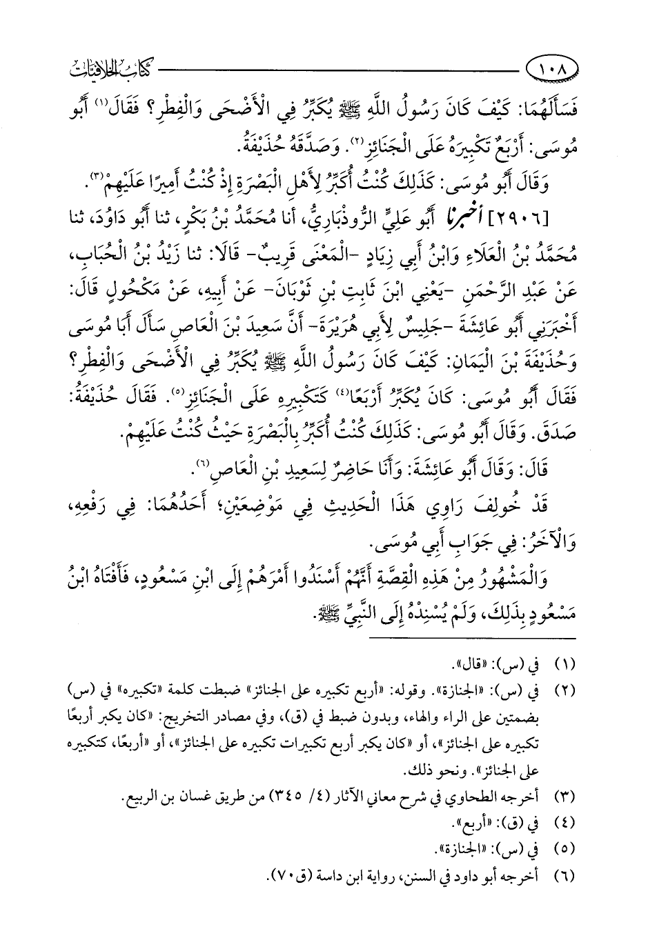 [2906] أخبرنا أَبُو عَلِيٍّ الرُّوذْبَارِيُّ، أنا مُحَمَّدُ بْنُ بَكْرٍ، ثنا أَبُو دَاوُدَ، ثنا مُحَمَّدُ بْنُ الْعَلَاءِ وَابْنُ أَبِي زِيَادٍ - الْمَعْنَى قَرِيبٌ - قَالَا: ثنا زَيْدُ بْنُ الْحُبَابِ، عَنْ عَبْدِ الرَّحْمَنِ - يَعْنِي ابْنَ ثَابِتِ بْنِ ثَوْبَانَ - عَنْ أَبِيهِ، عَنْ مَكْحُولٍ قَالَ: أَخْبَرَنِي أَبُو عَائِشَةَ - جَلِيسٌ لِأَبِي هُرَيْرَةَ - أَنَّ سَعِيدَ بْنَ الْعَاصِ سَأَلَ أَبَا مُوسَى وَحُذَيْفَةَ بْنَ الْيَمَانِ: كَيْفَ كَانَ رَسُولُ اللَّهِ - صلى الله عليه وسلم - يُكَبِّرُ فِي الْأَضْحَى وَالْفِطْرِ؟ فَقَالَ أَبُو مُوسَى: كَانَ يُكَبِّرُ أَرْبَعًا (¬4) كَتَكْبِيرِهِ عَلَى الْجَنَائِزِ (¬5). فَقَالَ حُذَيْفَةُ: صَدَقَ. وَقَالَ أَبُو مُوسَى: كَذَلِكَ كُنْتُ أُكَبِّرُ بِالْبَصْرَةِ حَيْثُ كُنْتُ عَلَيْهِمْ.