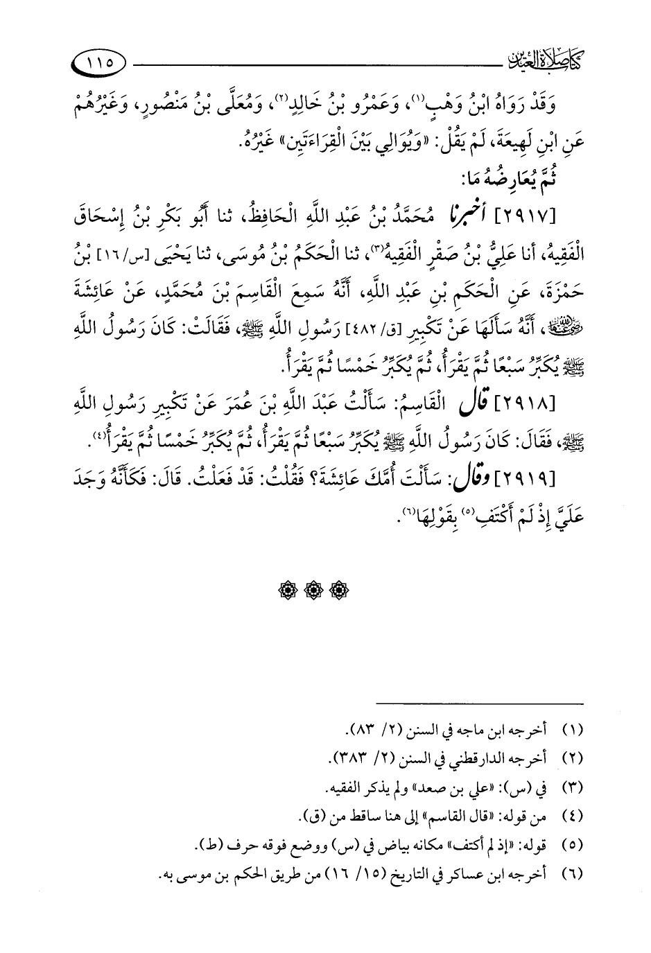 [2918] قال الْقَاسِمُ: سَأَلْتُ عَبْدَ اللَّهِ بْنَ عُمَرَ عَنْ تَكْبِيرِ رَسُولِ اللَّهِ - صلى الله عليه وسلم -، فَقَالَ: كَانَ رَسُولُ اللَّهِ - صلى الله عليه وسلم - يُكَبِّرُ سَبْعًا ثُمَّ يَقْرَأُ، ثُمَّ يُكَبِّرُ خَمْسًا ثُمَّ يَقْرَأُ (¬4).
