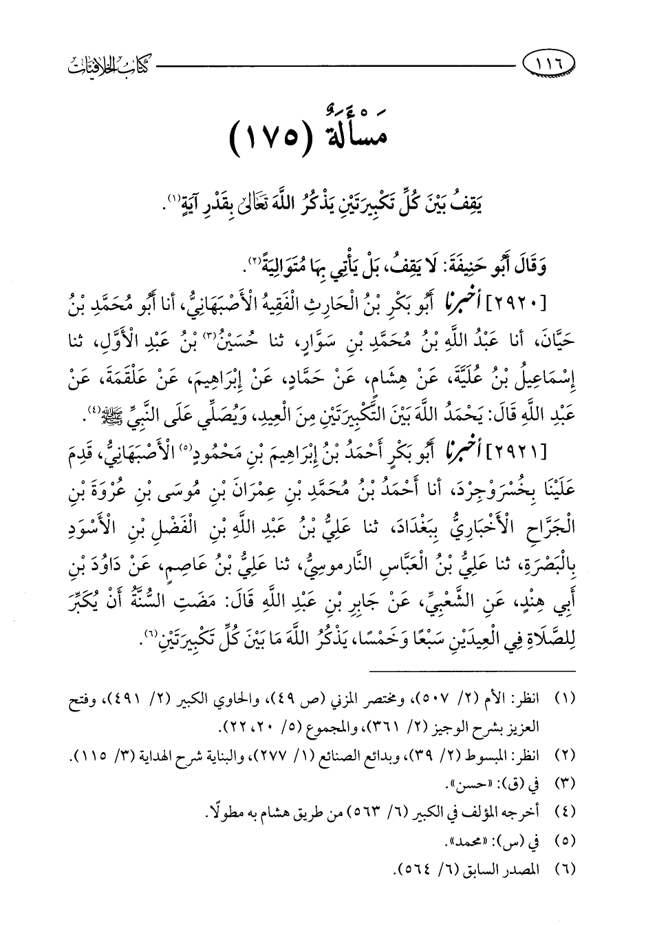 [2920] أخبرنا أَبُو بَكْرِ بْنُ الْحَارِثِ الْفَقِيهُ الْأَصْبَهَانِيُّ، أنا أَبُو مُحَمَّدِ بْنُ حَيَّانَ، أنا عَبْدُ اللَّهِ بْنُ مُحَمَّدِ بْنِ سَوَّارٍ، ثنا حُسَيْنُ (¬3) بْنُ عَبْدِ الْأَوَّلِ، ثنا إِسْمَاعِيلُ بْنُ عُلَيَّةَ، عَنْ هِشَامٍ، عَنْ حَمَّادٍ، عَنْ إِبْرَاهِيمَ، عَنْ عَلْقَمَةَ، عَنْ عَبْدِ اللَّهِ قَالَ: يَحْمَدُ اللَّهَ بَيْنَ التَّكْبِيرَتَيْنِ مِنَ الْعِيدِ، وَيُصَلِّي عَلَى النَّبِيِّ - صلى الله عليه وسلم - (¬4).