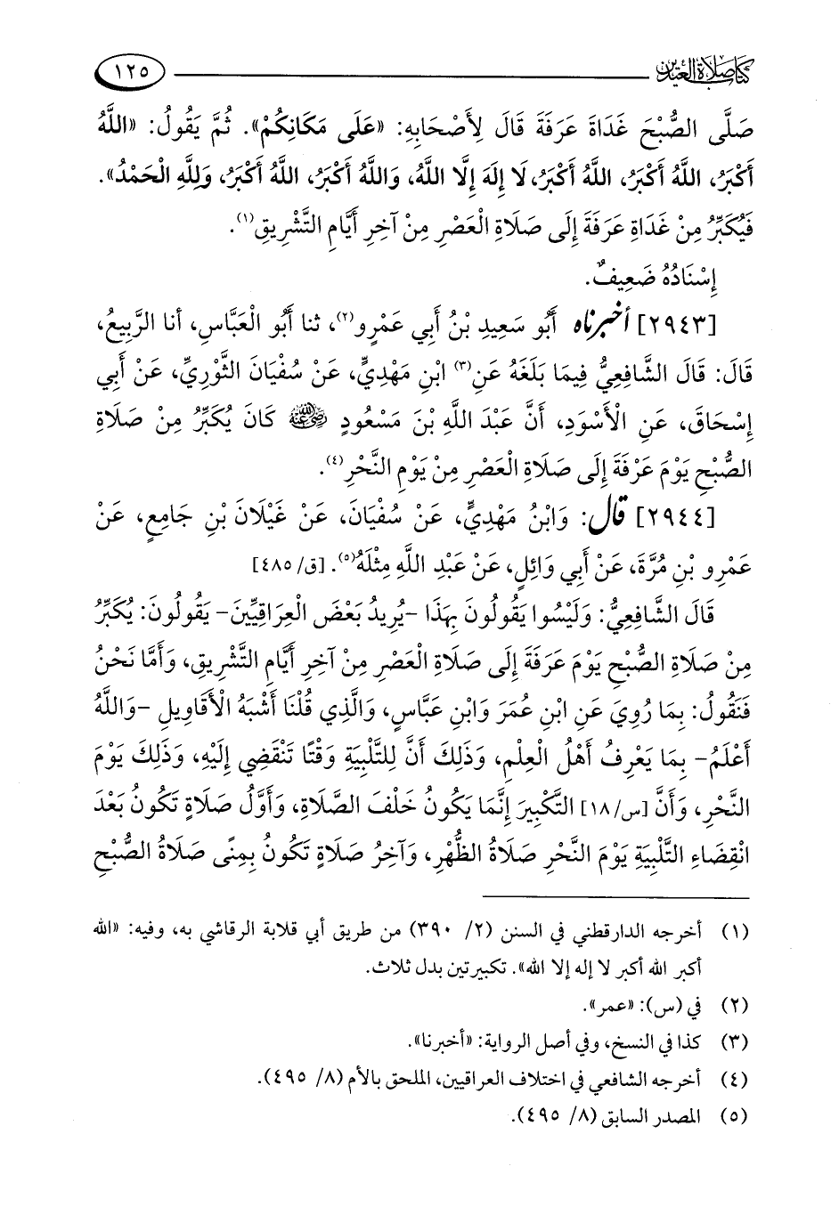 [2943] أخبرناه أَبُو سَعِيدِ بْنُ أَبِي عَمْرٍو (¬2)، ثنا أَبُو الْعَبَّاسِ، أنا الرَّبِيعُ، قَالَ: قَالَ الشَّافِعِيُّ فِيمَا بَلَغَهُ عَنِ (¬3) ابْنِ مَهْدِيٍّ، عَنْ سُفْيَانَ الثَّوْرِيِّ، عَنْ أَبِي إِسْحَاقَ، عَنِ الْأَسْوَدِ، أَنَّ عَبْدَ اللَّهِ بْنَ مَسْعُودٍ - رضي الله عنه - كَانَ يُكَبِّرُ مِنْ صَلَاةِ الصُّبْحِ يَوْمَ عَرْفَةَ إلَى صَلَاةِ الْعَصْرِ مِنْ يَوْمِ النَّحْرِ (¬4).