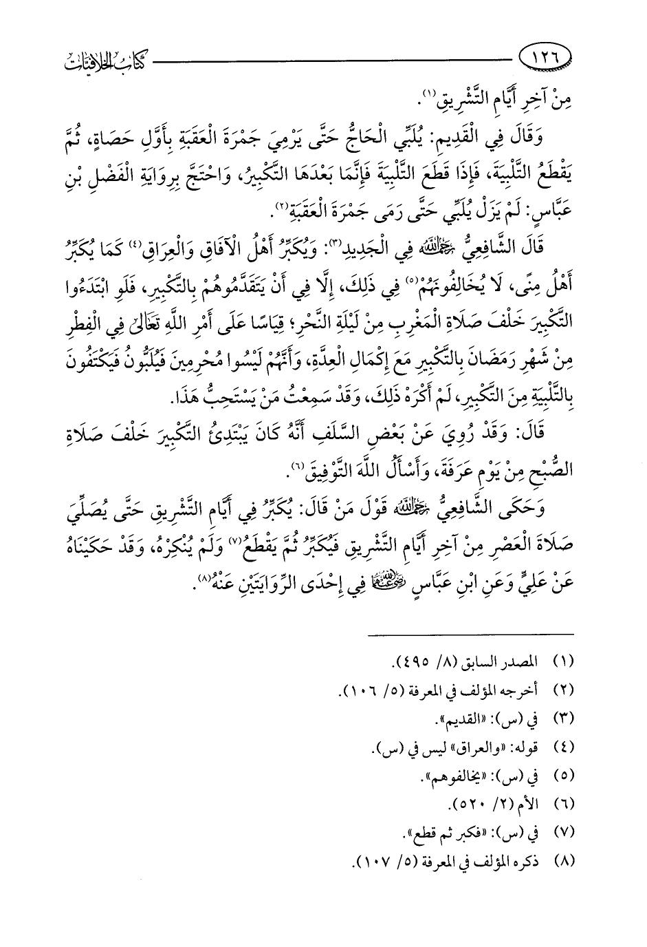 وَحَكَى الشَّافِعِيُّ - رحمه الله - قَوْلَ مَنْ قَالَ: يُكَبِّرُ فِي أَيَّامِ التَّشْرِيقِ حَتَّى يُصَلِّيَ صَلَاةَ الْعَصْرِ مِنْ آخِرِ أَيَّامِ التَّشْرِيقِ فَيُكَبِّرُ ثُمَّ يَقْطَعُ (¬7) وَلَمْ يُنْكِرْهُ، وَقَدْ حَكَيْنَاهُ عَنْ عَلِيٍّ وَعَنِ ابْنِ عَبَّاسٍ - رضي الله عنهما - فِي إِحْدَى الرِّوَايَتَيْنِ عَنْهُ (¬8).