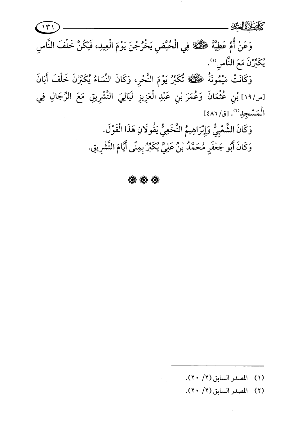 وَعَنْ أُمِّ عَطِيَّةَ - رضي الله عنها - فِي الْحُيَّضِ يَخْرُجْنَ يَوْمَ الْعِيدِ، فَيَكُنَّ خَلْفَ النَّاسِ يُكَبِّرْنَ مَعَ النَّاسِ (¬1).