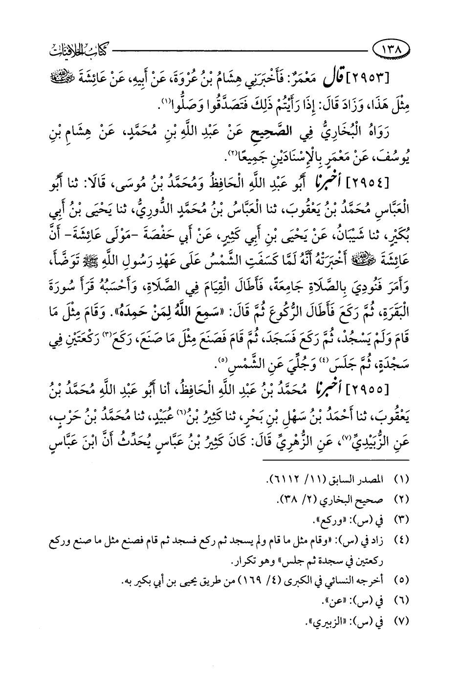 [2954] أخبرنا أَبُو عَبْدِ اللَّهِ الْحَافِظُ وَمُحَمَّدُ بْنُ مُوسَى، قَالَا: ثنا أَبُو الْعَبَّاسِ مُحَمَّدُ بْنُ يَعْقُوبَ، ثنا الْعَبَّاسُ بْنُ مُحَمَّدٍ الدُّورِيُّ، ثنا يَحْيَى بْنُ أَبِي بُكَيْرٍ، ثنا شَيْبَانُ، عَنْ يَحْيَى بْنِ أَبِي كَثِيرٍ، عَنْ أَبي حَفْصَةَ - مَوْلَى عَائِشَةَ - أَنَّ عَائِشَةَ - رضي الله عنها - أَخْبَرَتْهُ أَنَّهُ لَمَّا كَسَفَتِ الشَّمْسُ عَلَى عَهْدِ رَسُولِ اللَّهِ - صلى الله عليه وسلم - تَوَضَّأَ، وَأَمَرَ فَنُودِيَ بِالصَّلَاةِ جَامِعَةً، فَأَطَالَ الْقِيَامَ فِي الصَّلَاةِ، وَأَحْسَبُهُ قَرَأَ سُورَةَ الْبَقَرَةِ، ثُمَّ رَكَعَ فَأَطَالَ الرُّكُوعَ ثُمَّ قَالَ: "سَمِعَ اللَّهُ لِمَنْ حَمِدَهُ". وَقَامَ مِثْلَ مَا قَامَ وَلَمْ يَسْجُدْ، ثُمَّ رَكَعَ فَسَجَدَ، ثُمَّ قَامَ فَصَنَعَ مِثْلَ مَا صَنَعَ، رَكَعَ (¬3) رَكْعَتَيْنِ فِي سَجْدَةٍ، ثُمَّ جَلَسَ (¬4) وَجُلِّيَ عَنِ الشَّمْسِ (¬5).