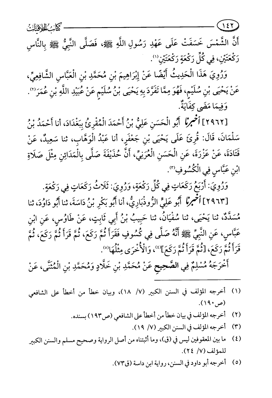 [2962] أخبرنا أَبُو الْحَسَنِ عَلِيُّ بْنُ أَحْمَدَ الْمُقْرِئُ بِبَغْدَادَ، أنا أَحْمَدُ بْنُ سَلْمَانَ، قَالَ: قُرِئَ عَلَى يَحْيَى بْنِ جَعْفَرٍ، أنا عَبْدُ الْوَهَّابِ، ثنا سَعِيدٌ، عَنْ قَتَادَةَ، عَنْ عَزْرَةَ، عَنِ الْحَسَنِ الْعُرَنِيِّ، أَنَّ حُذَيْفَةَ صَلَّى بِالْمَدَائِنِ مِثْلَ صَلَاةِ ابْنِ عَبَّاسٍ فِي الْكُسُوفِ (¬3).