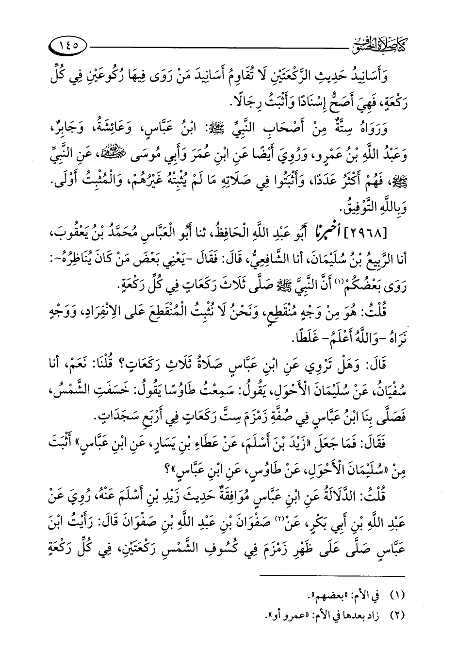 [2968] أخبرنا أَبُو عَبْدِ اللَّهِ الْحَافِظُ، ثنا أَبُو الْعَبَّاسِ مُحَمَّدُ بْنُ يَعْقُوبَ، أنا الرَّبِيعُ بْنُ سُلَيْمَانَ، أنا الشَّافِعِيُّ، قَالَ: فَقَالَ - يَعْنِي بَعْضَ مَنْ كَانَ يُنَاظِرُهُ -: رَوَى بَعْضُكُمْ (¬1) أَنَّ النَّبِيَّ - صلى الله عليه وسلم - صَلَّى ثَلَاثَ رَكَعَاتٍ فِي كُلِّ رَكْعَةٍ.
