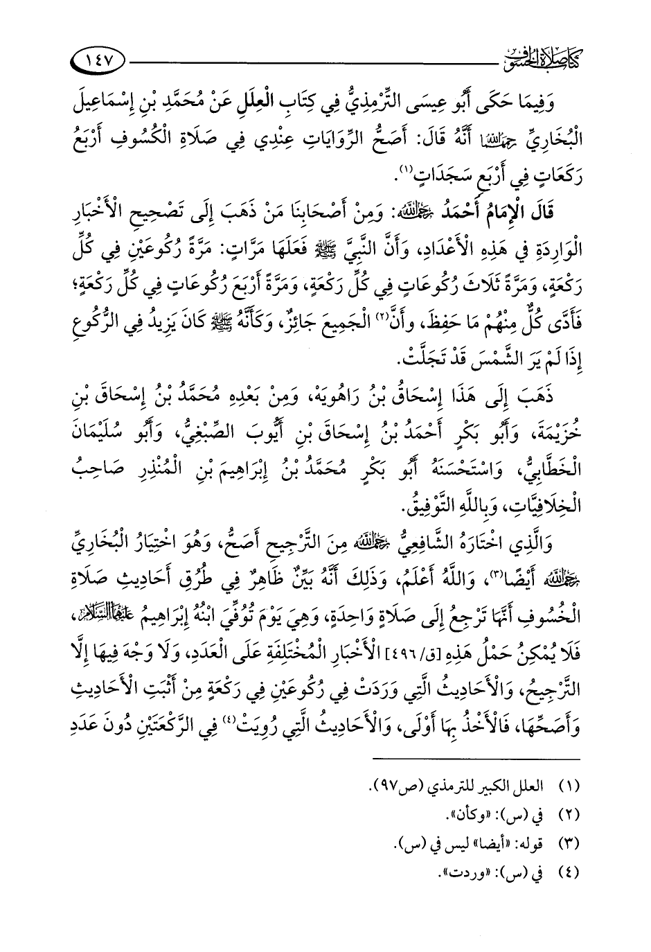 وَفِيمَا حَكَى أَبُو عِيسَى التِّرْمذِيُّ فِي كِتَابِ الْعِلَلِ عَنْ مُحَمَّدِ بْنِ إِسْمَاعِيلَ الْبُخَارِيِّ - رحمهما الله - أَنَّهُ قَالَ: أَصَحُّ الرِّوَايَاتِ عِنْدِي فِي صَلَاةِ الْكُسُوفِ أَرْبَعُ رَكَعَاتٍ فِي أَرْبَعِ سَجَدَاتٍ (¬1).