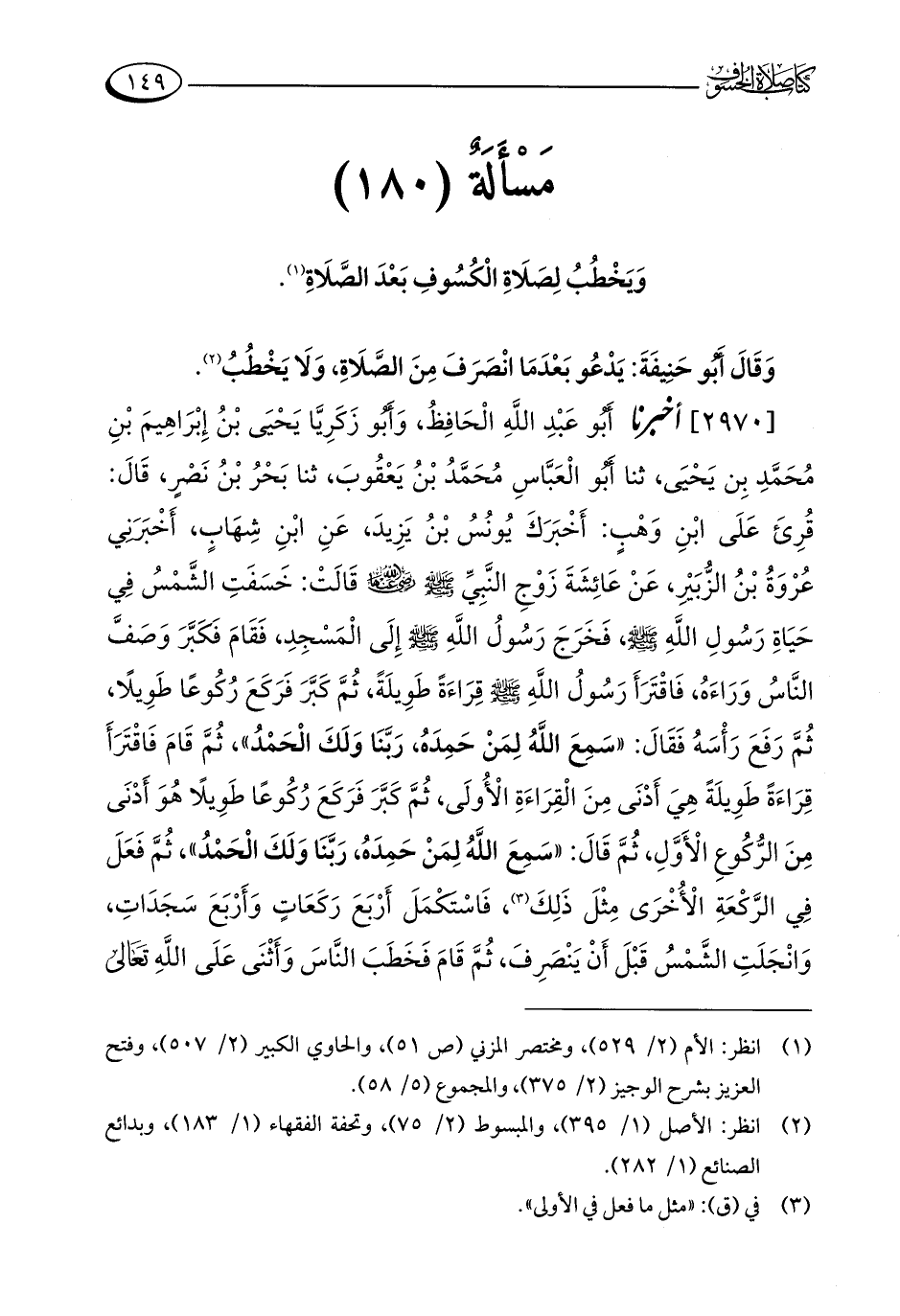 [2970] أخبرنا أَبُو عَبْدِ اللَّهِ الْحَافِظُ، وَأَبُو زَكَرِيَّا يَحْيَى بْنُ إِبْرَاهِيمَ بْنِ مُحَمَّدِ بِن يَحْيَى، ثنا أَبُو الْعَبَّاسِ مُحَمَّدُ بْنُ يَعْقُوبَ، ثنا بَحْرُ بْنُ نَصْرٍ، قَالَ: قُرِئَ عَلَى ابْنِ وَهْبٍ: أَخْبَرَكَ يُونُسُ بْنُ يَزِيدَ، عَنِ ابْنِ شِهَابٍ، أَخْبَرَنِي عُرْوَةُ بْنُ الزُّبَيْرِ، عَنْ عَائِشَةَ زَوْجِ النَّبِيِّ - صلى الله عليه وسلم - رضي الله عنها - قَالَتْ: خَسَفَتِ الشَّمْسُ فِي حَيَاةِ رَسُولِ اللَّهِ - صلى الله عليه وسلم -، فَخَرَجَ رَسُولُ اللَّهِ - صلى الله عليه وسلم - إِلَى الْمَسْجِدِ، فَقَامَ فَكَبَّرَ وَصَفَّ النَّاسُ وَرَاءَهُ، فَاقْتَرَأَ رَسُولُ اللَّهِ - صلى الله عليه وسلم - قِرَاءَةً طَوِيلَةً، ثُمَّ كَبَّرَ فَرَكَعَ رُكُوعًا طَوِيلًا، ثُمَّ رَفَعَ رَأْسَهُ فَقَالَ: "سَمِعَ اللَّهُ لِمَنْ حَمِدَهُ، رَبَّنَا وَلَكَ الْحَمْدُ"، ثُمَّ قَامَ فَاقْتَرَأَ قِرَاءَةً طَوِيلَةً هِيَ أَدْنَى مِنَ الْقِرَاءَةِ الْأُولَى، ثُمَّ كَبَّرَ فَرَكَعَ رُكُوعًا طَوِيلًا هُوَ أَدْنَى مِنَ الرُّكُوعِ الْأَوَّلِ، ثُمَّ قَالَ: "سَمِعَ اللَّهُ لِمَنْ حَمِدَهُ، رَبَّنَا وَلَكَ الْحَمْدُ"، ثُمَّ فَعَلَ فِي الرَّكْعَةِ الْأُخْرَى مِثْلَ ذَلِكَ (¬3)، فَاسْتَكْمَلَ أَرْبَعَ رَكَعَاتٍ وَأَرْبَعَ سَجَدَاتِ، وَانْجَلَتِ الشَّمْسُ قَبْلَ أَنْ يَنْصَرِفَ، ثُمَّ قَامَ فَخَطَبَ النَّاسَ وَأَثْنَى عَلَى اللَّهِ تَعَالى