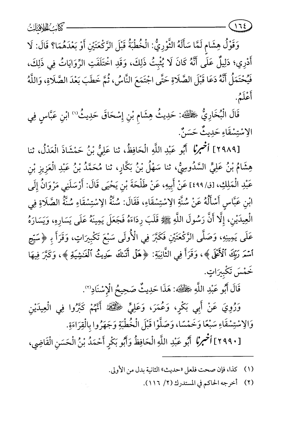 وَقَوْلُ هِشَامٍ لَمَّا سَأَلَهُ الثَّوْرِيُّ: الْخُطْبَةُ قَبْلَ الرَّكْعَتَيْنِ أَوْ بَعْدَهُمَا؟ قَالَ: لَا أَدْرِي؛ دَلِيلٌ عَلَى أَنَّهُ كَانَ لَا يُثْبِتُ ذَلِكَ، وَقَدِ اخْتَلَفَتِ الرِّوَايَاتُ فِي ذَلِكَ، فَيُحْتَمَلُ أَنَّهُ دَعَا قَبْلَ الصَّلَاةِ حَتَّى اجْتَمَعَ النَّاسُ، ثُمَّ خَطَبَ بَعْدَ الصَّلَاةِ، وَاللَّهُ أَعْلَمُ.