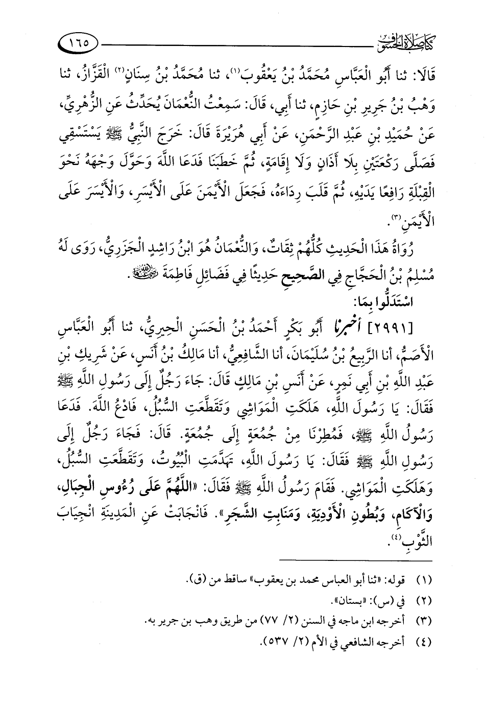 [2991] أخبرنا أَبُو بَكْرٍ أَحْمَدُ بْنُ الْحَسَنِ الْحِيرِيُّ، ثنا أَبُو الْعَبَّاسِ الْأَصَمُّ، أنا الرَّبِيعُ بْنُ سُلَيْمَانَ، أنا الشَّافِعِيُّ، أنا مَالِكُ بْنُ أَنَسٍ، عَنْ شَرِيكِ بْنِ عَبْدِ اللَّهِ بْنِ أَبِي نَمِرٍ، عَنْ أَنَسِ بْنِ مَالِكٍ قَالَ: جَاءَ رَجُلٌ إِلَى رَسُولِ اللَّهِ - صلى الله عليه وسلم - فَقَالَ: يَا رَسُولَ اللَّهِ، هَلَكَتِ الْمَوَاشِي وَتَقَطَّعَتِ السُّبُلُ، فَادْعُ اللَّهَ. فَدَعَا رَسُولُ اللَّهِ - صلى الله عليه وسلم -، فَمُطِرْنَا مِنْ جُمُعَةٍ إِلَى جُمُعَةٍ. قَالَ: فَجَاءَ رَجُلٌ إِلَى رَسُولِ اللَّهِ - صلى الله عليه وسلم - فَقَالَ: يَا رَسُولَ اللَّهِ، تهَدَّمَتِ الْبُيُوتُ، وَتَقَطَّعَتِ السُّبُلُ، وَهَلَكَتِ الْمَوَاشِي. فَقَامَ رَسُولُ اللَّهِ - صلى الله عليه وسلم - فَقَالَ: "اللَّهُمَّ عَلَى رُءُوسِ الْجِبَالِ، وَالْآكَامِ، وَبُطُونِ الْأَوْدِيَةِ، وَمَنَابِتِ الشَّجَرِ". فَانْجَابَتْ عَنِ الْمَدِينَةِ انْجِيَابَ الثَّوْبِ (¬4).