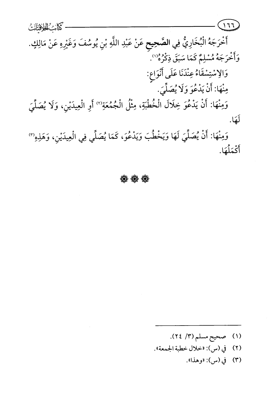 وَمِنْهَا: أَنْ يُصَلِّيَ لَهَا وَيَخْطُبَ وَيَدْعُوَ، كَمَا يُصَلِّي فِي الْعِيدَيْنِ، وَهَذِهِ (¬3) أَكْمَلُهَا.