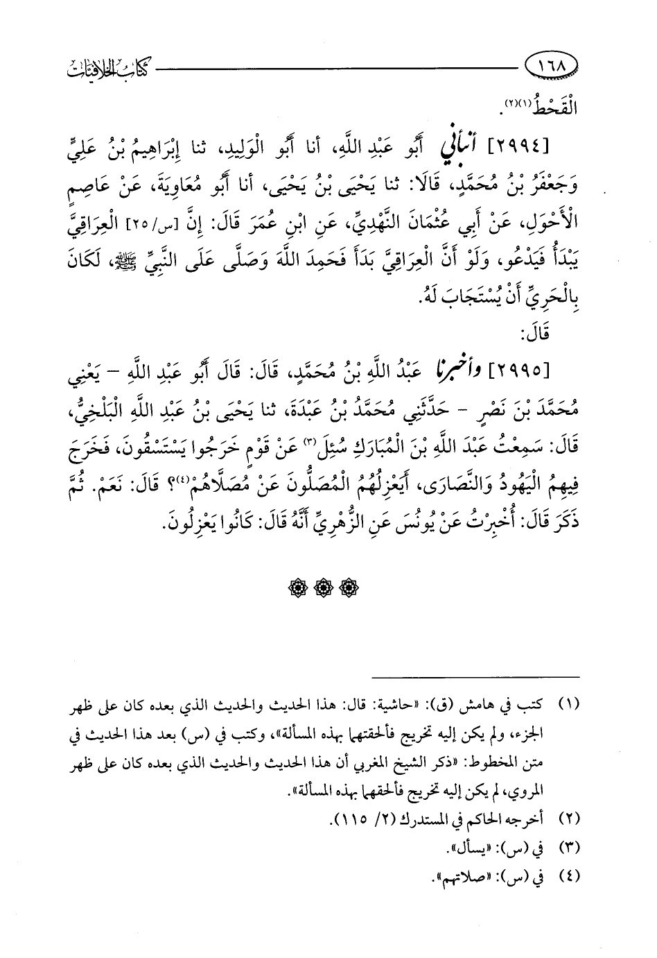 [2994] أنبأني أَبُو عَبْدِ اللَّهِ، أنا أَبُو الْوَلِيدِ، ثنا إِبْرَاهِيمُ بْنُ عَلِيٍّ وَجَعْفَرُ بْنُ مُحَمَّدٍ، قَالَا: ثنا يَحْيَى بْنُ يَحْيَى، أنا أَبُو مُعَاوِيَةَ، عَنْ عَاصِمٍ الْأَحْوَلِ، عَنْ أَبِي عُثْمَانَ النَّهْدِيِّ، عَنِ ابْنِ عُمَرَ قَالَ: إِنَّ الْعِرَاقِيَّ يَبْدَأُ فَيَدْعُو، وَلَوْ أَنَّ الْعِرَاقِيَّ بَدَأَ فَحَمِدَ اللَّهَ وَصَلَّى عَلَى النَّبِيِّ - صلى الله عليه وسلم -، لَكَانَ بِالْحَرِيِّ أَنْ يُسْتَجَابَ لَهُ.