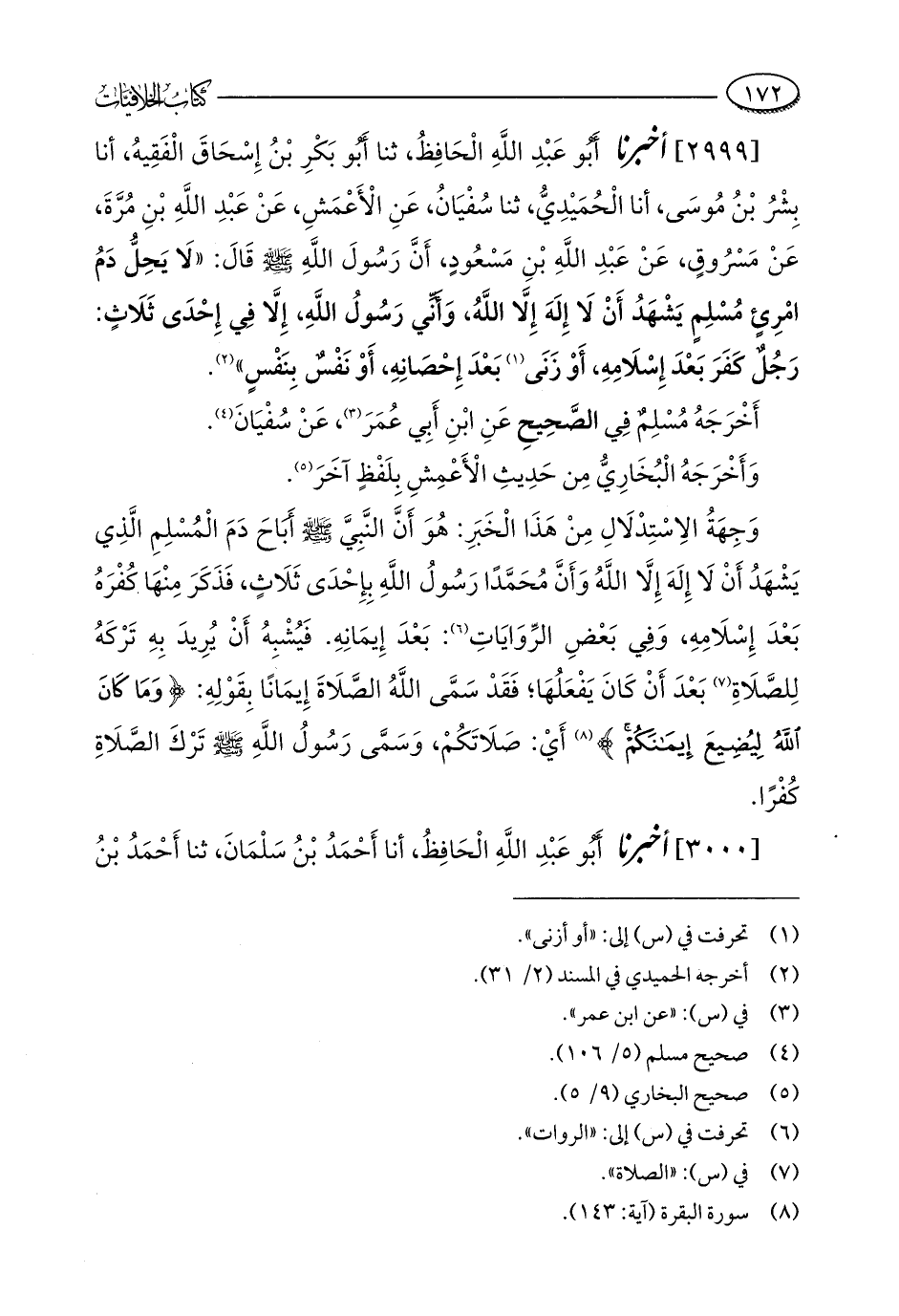 [2999] أخبرنا أَبُو عَبْدِ اللَّهِ الْحَافِظُ، ثنا أَبُو بَكْرِ بْنُ إِسْحَاقَ الْفَقِيهُ، أنا بِشْرُ بْنُ مُوسَى، أنا الْحُمَيْدِيُّ، ثنا سُفْيَانُ، عَنِ الْأَعْمَشِ، عَنْ عَبْدِ اللَّهِ بْنِ مُرَّةَ، عَنْ مَسْرُوقٍ، عَنْ عَبْدِ اللَّهِ بْنِ مَسْعُودٍ، أَنَّ رَسُولَ اللَّهِ - صلى الله عليه وسلم - قَالَ: "لَا يَحِلُّ دَمُ امْرِئٍ مُسْلِمٍ يَشْهَدُ أَنْ لَا إِلَهَ إِلَّا اللَّهُ، وَأَنِّي رَسُولُ اللَّهِ، إِلَّا فِي إِحْدَى ثَلَاثٍ: رَجُلٌ كَفَرَ بَعْدَ إِسْلَامِهِ، أَوْ زَنَى (¬1) بَعْدَ إِحْصَانِهِ، أَوْ نَفْسٌ بِنَفْسٍ" (¬2).
