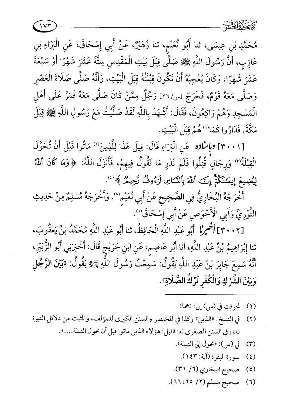 [3001] وبإسناده عَنِ الْبَرَاءِ قَالَ: قِيلَ هَذَا لِلَّذِينَ (¬2) مَاتُوا قَبْلَ أَنْ تُحَوَّلَ الْقِبْلَةُ (¬3) وَرِجَالٍ قُتِلُوا فَلَمْ نَدْرِ مَا نَقُولُ فِيهِمْ، فَأَنْزَلَ اللَّهُ: {وَمَا كَانَ اللَّهُ لِيُضِيعَ إِيمَانَكُمْ إِنَّ اللَّهَ بِالنَّاسِ لَرَءُوفٌ رَحِيمٌ} (¬4).