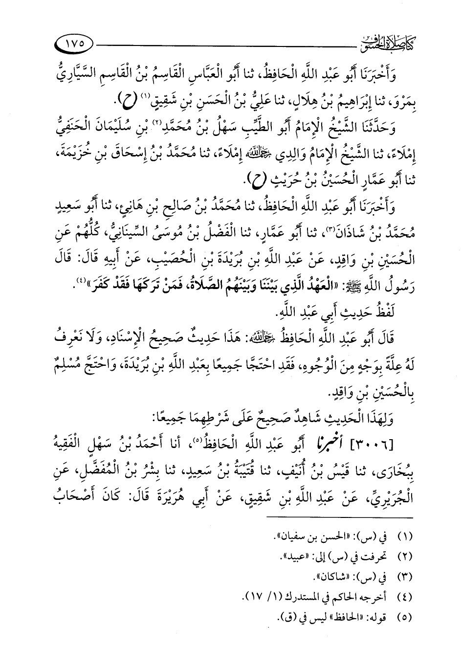 وَأَخْبَرَنَا أَبُو عَبْدِ اللَّهِ الْحَافِظُ، ثنا مُحَمَّدُ بْنُ صَالِحِ بْنِ هَانِئٍ، ثنا أَبُو سَعِيدٍ مُحَمَّدُ بْنُ شَاذَانَ (¬3)، ثنا أَبُو عَمَّارٍ، ثنا الْفَضْلُ بْنُ مُوسَىُ السِّينَانِيُّ، كُلُّهُمْ عَنِ الْحُسَيْنِ بْنِ وَاقِدٍ، عَنْ عَبْدِ اللَّهِ بْنِ بُرَيْدَةَ بْنِ الْحُصَيْبِ، عَنْ أَبِيهِ قَالَ: قَالَ رَسُولُ اللَّهِ - صلى الله عليه وسلم -: "الْعَهْدُ الَّذِي بَيْنَنَا وَبَيْنَهُمُ الصَّلَاةُ، فَمَنْ تَرَكَهَا فَقَدْ كَفَرَ" (¬4).